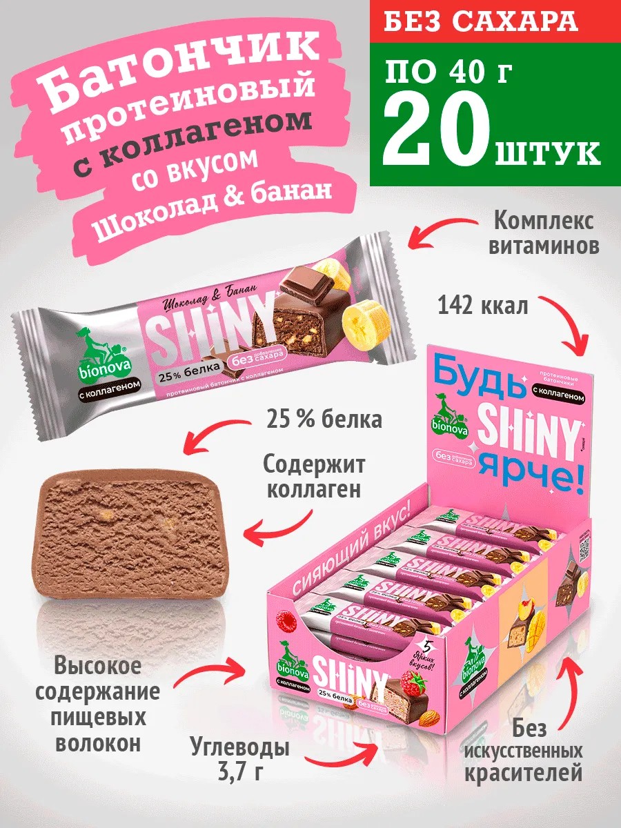 Глазированный протеиновый батончик Shiny Bionova Банан-шоколад — это вкусный и сбалансированный перекус для тех, кто заботится о своём здоровье и фигуре. Содержит 25% белка, который помогает поддерживать мышечную массу, способствует восстановлению после тренировок и обеспечивает длительное чувство сытости. Отлично подойдёт для активных людей, следящих за рационом и ценящих сочетание пользы и насыщенного вкуса.