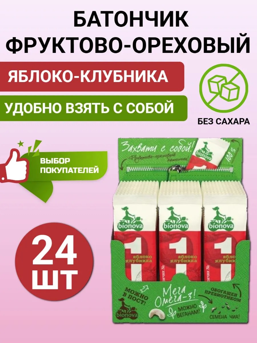 КомплектацияБатончик фруктово-ореховый Бионова с яблоком и клубникой 35г по 24шт