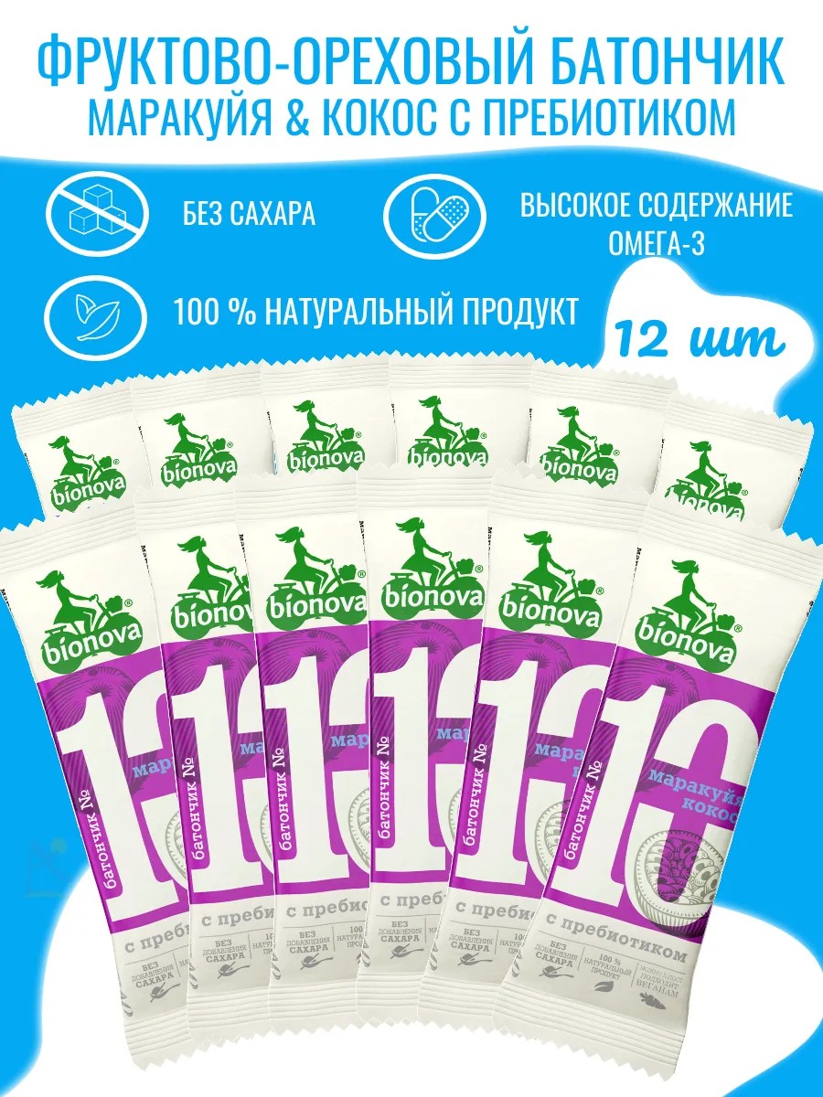 Фруктово-ореховый батончик Bionova с маракуйей и кокосом — полностью натуральный перекус для любой ситуации. Возьми с собой в дорогу, на прогулку или на работу. Здоровый перекус подарит заряд бодрости и поднимет настроение. Раздели его с другом, наслаждайся натуральным вкусом и полезными ингредиентами. Набор содержит 12 штук по 35 граммов.