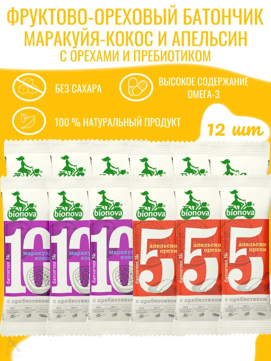 Фруктово-ореховые батончики Bionova с маракуйей, кокосом и апельсином — полностью натуральный перекус для любой ситуации. Возьми с собой в дорогу, на прогулку или на работу. Здоровый перекус подарит заряд бодрости и поднимет настроение. Раздели его с другом, наслаждайся натуральным вкусом и полезными ингредиентами. Набор ассорти содержит 12 штук по 35 граммов: 6 шт с маракуйей и кокосом и 6 шт с апельсином.