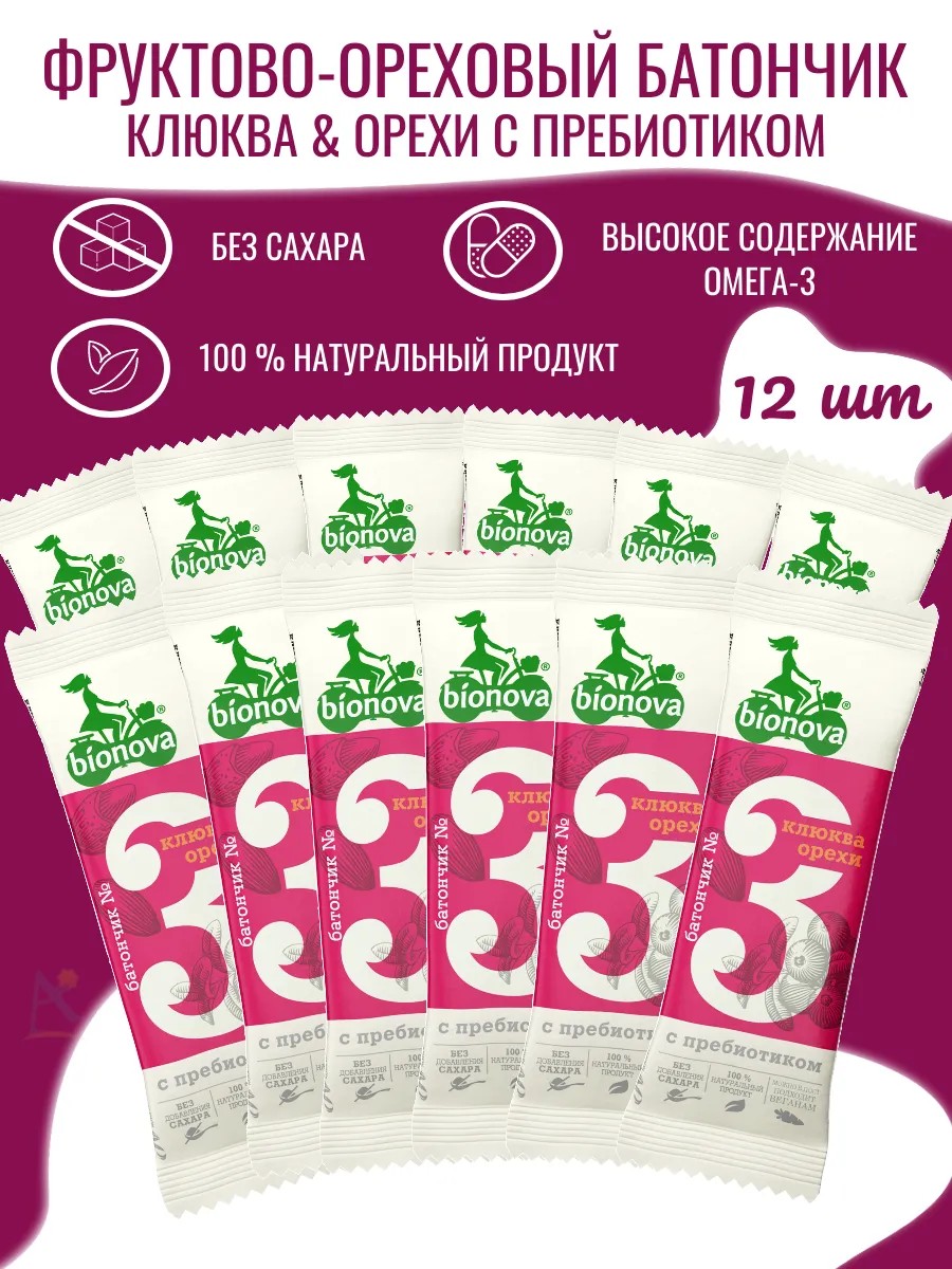 Полезные фитнес батончики Bionova созданы для тех, кто выбирает здоровый образ жизни. В них нет добавленного сахара, глютена и консервантов. Только натуральные ингредиенты: ягоды, орехи, семена и инулин, который поддерживает пищеварение. Подходят веганам и тем, кто следит за питанием. Продукт может содержать фрагменты косточек.