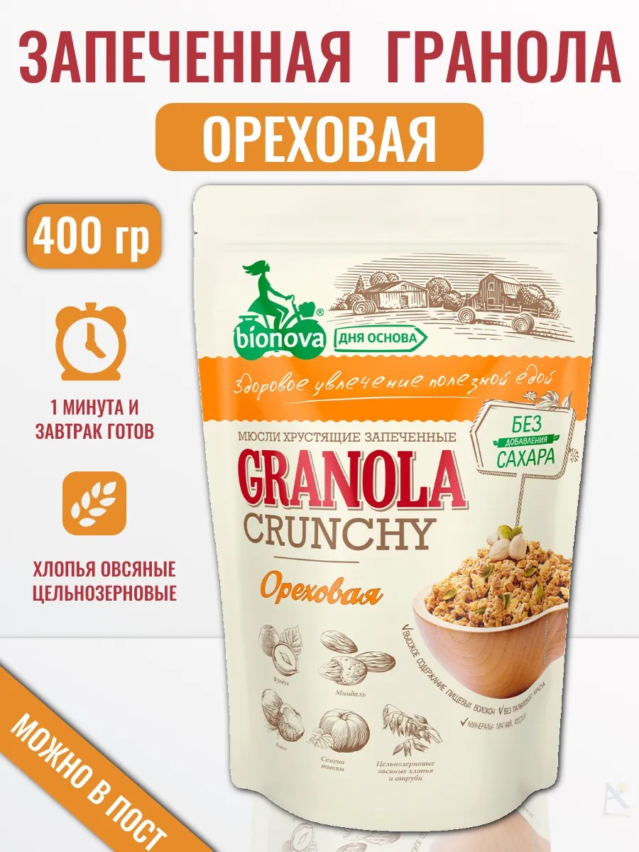 BIONOVA nut granola is part of a range of sugar-free products that are ideal for vegans, those fasting, and those pursuing a healthy lifestyle. This product is made in Russia from natural ingredients and is low in calories.