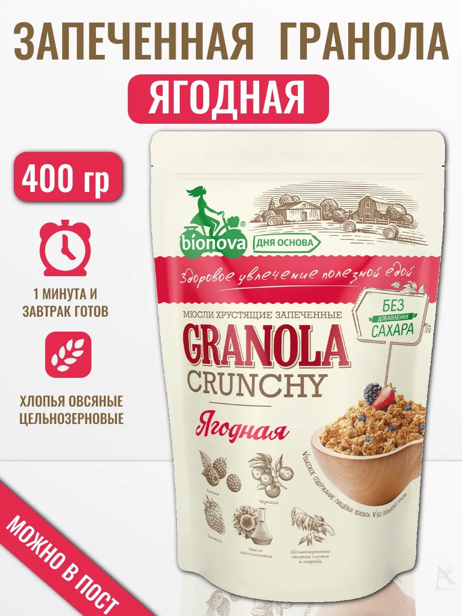 Комбинация злаков и ягод обогащает рацион пищевыми волокнами, витаминами и минералами. Гранола BIONOVA содержит клетчатку, поддерживающую систему пищеварения. В лесных ягодах содержатся витамины А, В, С, РР, Е, К, бета-каротин, минеральные вещества. Такой завтрак поддержит иммунную систему, особенно при авитаминозе. Это не просто еда, а часть полезного питания для тех, кто выбирает качественные готовые завтраки.