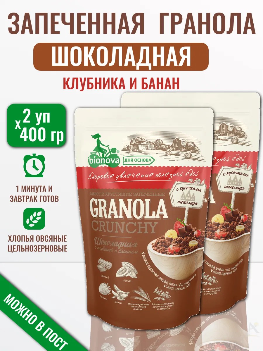Гранола BIONOVA шоколадная с клубникой и бананом — вкусный и полезный завтрак, который станет отличным началом дня. Идеальное сочетание овсяных хлопьев, шоколада, клубники и банана, что делает этот продукт незаменимым для любителей здорового питания и полезных перекусов. Набор содержит 2 шт по 400 граммов. Каждая упаковка оснащена зип-замком для удобного хранения и транспортировки. Идеальный формат для удобного и сбалансированного питания.