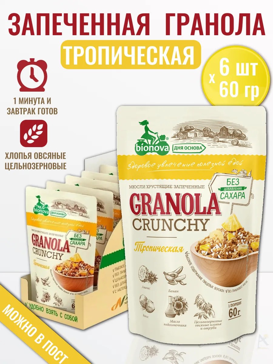 Гранола тропическая BIONOVA — это полезный хрустящий завтрак или перекус со вкусом лета. В каждой порции — запечённые злаки, кусочки ананаса, банана и кокоса. Продукт готов к употреблению и не требует варки. Просто добавьте молоко, йогурт, сок или растительный напиток — и получите вкусное блюдо за минуту. В наборе 6 удобных порций по 60 граммов.