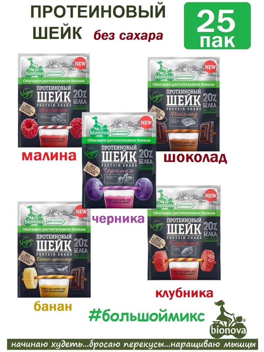 Протеиновый коктейль для спортсменов и похудения от Bionova. Оптовый набор из 25 пакетиков разного вкуса. Вкус: клубника, черника, малина, шоколад и шоколад – банан.