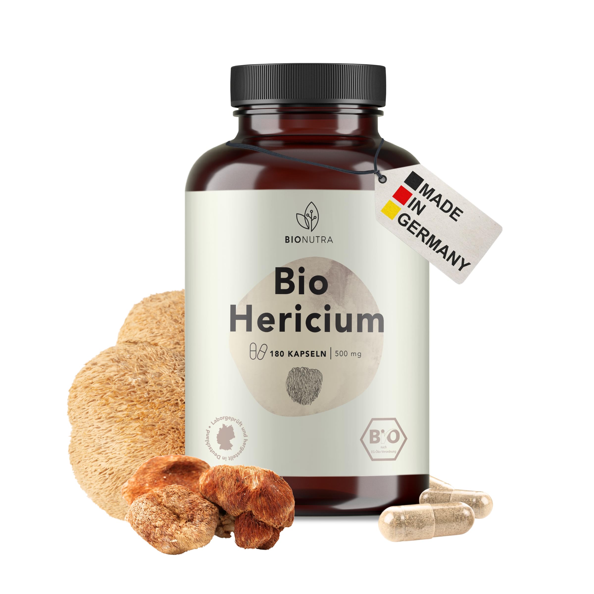 BIONUTRA – Where nature meets science. Our team of scientists with experience at Charité Berlin and nutritionists believe that nature provides answers to modern challenges. With organic superfoods and plant-based supplements we make conscious, healthy food accessible to everyone. VALUE FOR YOU AS A CUSTOMER – Quality does not have to be expensive. We opt for more content, less packaging, short delivery routes – and invest in personal customer service instead of expensive advertising. Your question will be answered within 24 hours by our founding team. GERMAN QUALITY – BIONUTRA capsules are produced in Germany according to HACCP guidelines. Our plant-based HPMC capsules are 100 vegan, free of lactose, gluten, magnesium stearate, titanium dioxide and other unnecessary additives. 6-MONTH SUPPLY: 180 capsules each containing 500 mg of organic Hericium powder (lion's mane mushroom powder organic) – with good bioavailability. Recommended daily dosage: 1–2 capsules, sufficient for up to 180 days. Note: In TCM, Hericium is considered a tonic for spleen and stomach Qi and used to harmonize the inner center. In naturopathy it is often combined with other vitality mushrooms such as Reishi or Cordyceps, as well as with plant adaptogens such as Ashwagandha or Brahmi. HERICIUM CAPSULES ORGANIC HIGH DOSE – High-quality organic Hericium powder (Hericium erinaceus) from the fruit body, gently dried and finely ground, from 100 controlled organic cultivation. Hericium, also known as monkey's head mushroom, lion's mane mushroom or wig mushroom, is a popular vitality mushroom from traditional Chinese herbal medicine. Erinacins from the fruiting body are incregly attracting scientific interest.BIONUTRA Bio Hericium Capsules hooggedoseerd, 1000 mg dag, residugecontroleerd, Duitse productie, vegan, lactose- glutenvrij, zonder toevoegingen, leeuwenmanenpaddenstoel, 180 stuks x 500 mgBIONUTRA – Waar natuur wetenschap ontmoet. Ons team van wetenschappers met ervaring aan de Charité Berlijn en voedingsdeskundigen gelooft dat de natuur antwoorden biedt op moderne uitdagingen. Met biologische superfoods en plantaardige supplementen maken wij bewuste, gezonde voeding toegankelijk voor iedereen. WAARDE VOOR U ALS KLANT – Kwaliteit hoeft niet duur te zijn. Wij kiezen voor meer inhoud, minder verpakking, korte leverroutes – en investeren in persoonlijke klantenservice in plaats van dure reclame. Uw vraag wordt binnen 24 uur beantwoord door ons oprichtersteam. DUITSE KWALITEIT – De capsules van BIONUTRA worden geproduceerd in Duitsland volgens HACCP-richtlijnen. Onze plantaardige HPMC-capsules zijn 100 vegan, vrij van lactose, gluten, magnesiumstearaat, titaandioxide en andere onnodige toevoegingen. 6-MAANDENVOORRAAD: 180 capsules met elk 500 mg biologisch Hericiumpoeder (leeuwenmanenpaddenstoel poeder bio) – met goede biologische beschikbaarheid. Aanbevolen dagdosering: 1–2 capsules, voldoende voor tot wel 180 dagen. Opmerking: In de TCM wordt Hericium beschouwd als een tonicum voor milt- en maag-Qi en gebruikt om het innerlijke midden te harmoniseren. In de natuurgeneeskunde wordt het vaak gecombineerd met andere vitaliteitspaddenstoelen zoals Reishi of Cordyceps, evenals met plantaardige adaptogenen zoals Ashwagandha of Brahmi. HERICIUM CAPSULES BIO HOOGGEDOSEERD – Hoogwaardig biologisch Hericiumpoeder (Hericium erinaceus) uit het vruchtlichaam, zacht gedroogd en fijn gemalen, afkomstig uit 100 gecontroleerde biologische teelt. Hericium, ook bekend als apenkopzwam, leeuwenmanenpaddenstoel of pruikzwam, is een populaire vitaliteitspaddenstoel uit de traditionele Chinese kruidengeneeskunde. Erinacinen uit het vruchtlichaam staan steeds meer in de belangstelling van de wetenschap.