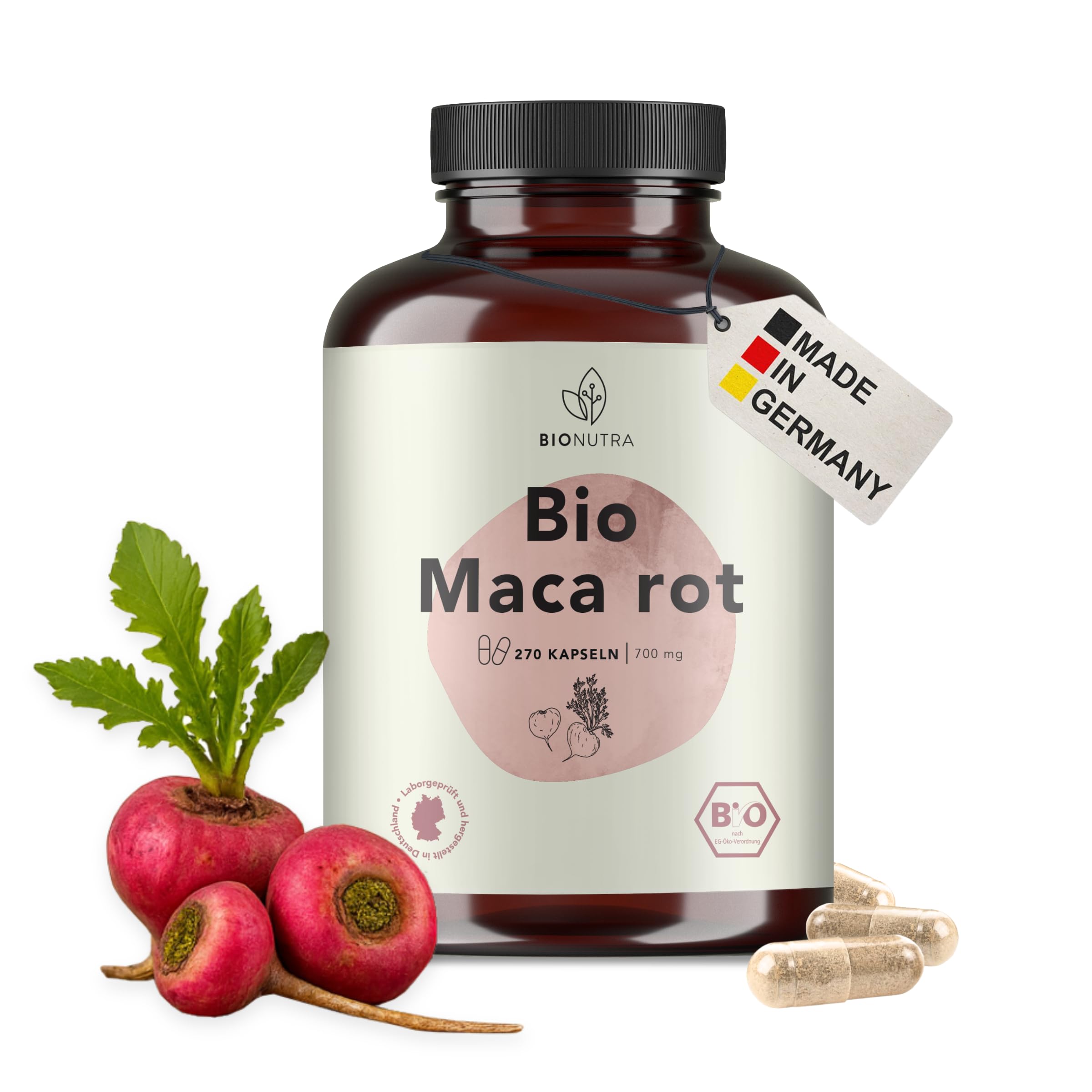 BIONUTRA – Where nature meets science. Our team of scientists with experience at Charité Berlin and nutritionists believe that nature provides answers to modern challenges. With organic superfoods and plant-based supplements we make conscious, healthy food accessible to everyone. VALUE FOR YOU AS A CUSTOMER – Quality does not have to be expensive. We opt for more content, less packaging, short delivery routes – and invest in personal customer service instead of expensive advertising. Your question will be answered within 24 hours by our founding team. GERMAN QUALITY – BIONUTRA capsules are produced in Germany according to HACCP guidelines. Our plant-based HPMC capsules are 100 vegan, free of lactose, gluten, magnesium stearate, titanium dioxide and other unnecessary additives. 2-MONTH SUPPLY – 270 capsules each containing 700 mg of red organic maca root powder, with good bioavailability. Recommended daily amount: 4–6 capsules – sufficient for up to 67 days of use. Tip: Maca combines well with Ayurvedic adaptogenic plants such as ashwagandha or shatavari, as well as with turmeric. Because some plant substances such as macamids or curcumin are fat-soluble, taking them with a fat-containing meal or with black cumin oil capsules can support absorption. RED MACA ORGANIC HIGH DOSE – High-quality organic maca powder from the red root (Lepidium meyenii), also known as "Andean ginseng", gently dried, finely ground and from 100 controlled organic cultivation. The intensely red carrot from the highlands of the Peruvian Andes has been part of the traditional diet for centuries – loved for its natural phytonutrient content. Research focuses mainly on the glucosinolates present.BIONUTRA Bio rode maca capsules hooggedoseerd 4200 mg dag, residugecontroleerd, Duitse productie, vegan, lactose- glutenvrij, zonder toevoegingen, 270 stuks x 700 mgBIONUTRA – Waar natuur wetenschap ontmoet. Ons team van wetenschappers met ervaring aan de Charité Berlijn en voedingsdeskundigen gelooft dat de natuur antwoorden biedt op moderne uitdagingen. Met biologische superfoods en plantaardige supplementen maken wij bewuste, gezonde voeding toegankelijk voor iedereen. WAARDE VOOR U ALS KLANT – Kwaliteit hoeft niet duur te zijn. Wij kiezen voor meer inhoud, minder verpakking, korte leverroutes – en investeren in persoonlijke klantenservice in plaats van dure reclame. Uw vraag wordt binnen 24 uur beantwoord door ons oprichtersteam. DUITSE KWALITEIT – De capsules van BIONUTRA worden geproduceerd in Duitsland volgens HACCP-richtlijnen. Onze plantaardige HPMC-capsules zijn 100 vegan, vrij van lactose, gluten, magnesiumstearaat, titaandioxide en andere onnodige toevoegingen. 2-MAANDENVOORRAAD – 270 capsules met elk 700 mg rood bio-macawortelpoeder, met goede biologische beschikbaarheid. Aanbevolen dagelijkse hoeveelheid: 4–6 capsules – voldoende voor tot 67 dagen gebruik. Tip: Maca laat zich goed combineren met ayurvedische adaptogene planten zoals ashwagandha of shatavari, evenals met kurkuma. Omdat sommige plantenstoffen zoals macamiden of curcumine vetoplosbaar zijn, kan inname met een vetbevattende maaltijd of met zwarte komijnoliecapsules de opname ondersteunen. RODE MACA BIO HOOGGEDOSEERD – Hoogwaardige bio-macapoeder uit de rode wortel (Lepidium meyenii), ook wel bekend als "Andes-ginseng", zacht gedroogd, fijn gemalen en afkomstig uit 100 gecontroleerde biologische teelt. De intens rode wortel uit de hooglanden van de Peruaanse Andes maakt al eeuwen deel uit van het traditionele voedingspatroon – geliefd om haar natuurlijke gehalte aan fytonutriënten. Onderzoek richt zich met name op de aanwezige glucosinolaten.