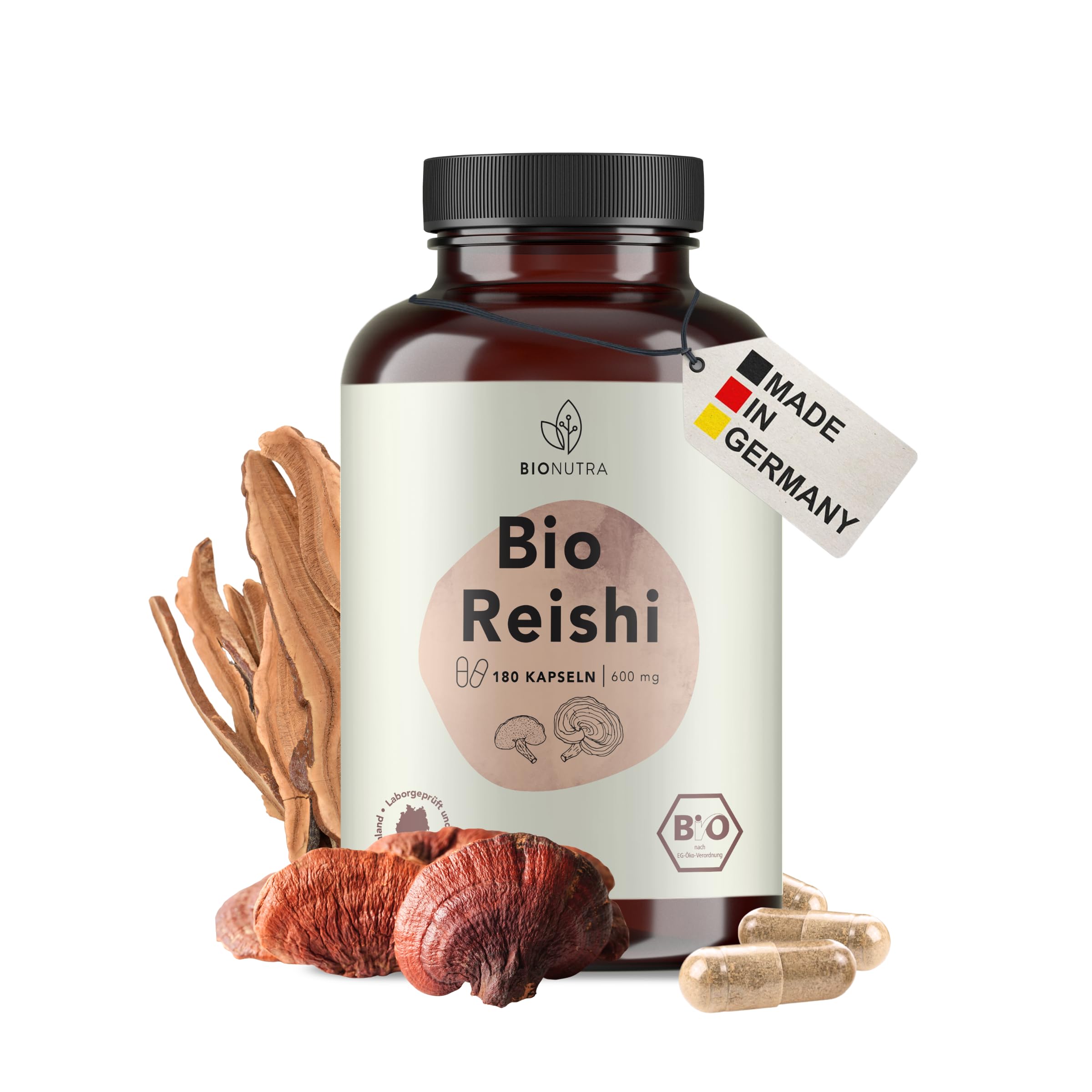 BIONUTRA – Where nature meets science. Our team of scientists with experience at Charité Berlin and nutritionists believe that nature provides answers to modern challenges. With organic superfoods and plant-based supplements we make conscious, healthy food accessible to everyone. VALUE FOR YOU AS A CUSTOMER – Quality does not have to be expensive. We opt for more content, less packaging, short delivery routes – and invest in personal customer service instead of expensive advertising. Your question will be answered within 24 hours by our founding team. GERMAN QUALITY – BIONUTRA capsules are produced in Germany according to HACCP guidelines. Our plant-based HPMC capsules are 100 vegan, free of lactose, gluten, magnesium stearate, titanium dioxide and other unnecessary additives. 6-MONTH SUPPLY: 180 capsules each containing 600 mg of organic Reishi powder, good bioavailability. Recommended daily dose: 1–2 capsules, sufficient for up to 180 days. Note: In traditional Chinese medicine, Reishi is associated with heart, lung and liver Qi and traditionally used to promote inner balance and harmony. Reishi also plays a central role in mushroom complexes and is often combined in herbal medicine with, for example, Cordyceps or Ashwagandha. REISHI CAPSULES ORGANIC HIGH DOSE – High-quality organic Reishi powder (Ganoderma lucidum) from the fruit body, gently dried, finely ground and from 100 controlled organic cultivation. Also known as "Lingzhi" or "lacquered tinder mushroom", Reishi has been valued in Asia for more than 4,000 years, often within dietary practices aimed at harmony between body and mind. To this day, it bears nicknames such as "king of medicinal mushrooms" or "mushroom of immortality".BIONUTRA Reishi Bio Capsules hooggedoseerd, 1200 mg dag, residugecontroleerd, Duitse productie, vegan, lactose- glutenvrij, zonder toevoegingen, Ganoderma lucidum, 180 stuks x 600 mgBIONUTRA – Waar natuur wetenschap ontmoet. Ons team van wetenschappers met ervaring aan de Charité Berlijn en voedingsdeskundigen gelooft dat de natuur antwoorden biedt op moderne uitdagingen. Met biologische superfoods en plantaardige supplementen maken wij bewuste, gezonde voeding toegankelijk voor iedereen. WAARDE VOOR U ALS KLANT – Kwaliteit hoeft niet duur te zijn. Wij kiezen voor meer inhoud, minder verpakking, korte leverroutes – en investeren in persoonlijke klantenservice in plaats van dure reclame. Uw vraag wordt binnen 24 uur beantwoord door ons oprichtersteam. DUITSE KWALITEIT – De capsules van BIONUTRA worden geproduceerd in Duitsland volgens HACCP-richtlijnen. Onze plantaardige HPMC-capsules zijn 100 vegan, vrij van lactose, gluten, magnesiumstearaat, titaandioxide en andere onnodige toevoegingen. 6-MAANDENVOORRAAD: 180 capsules met elk 600 mg biologische Reishi-poeder, goede biologische beschikbaarheid. Aanbevolen dagelijkse dosis: 1–2 capsules, voldoende voor tot wel 180 dagen. Opmerking: In de traditionele Chinese geneeskunde wordt Reishi in verband gebracht met het hart-, long- en lever-Qi en traditioneel gebruikt ter bevordering van innerlijke balans en harmonie. Reishi speelt bovendien een centrale rol in paddenstoelencomplexen en wordt in de kruidengeneeskunde vaak gecombineerd met bijvoorbeeld Cordyceps of Ashwagandha. REISHI CAPSULES BIO HOOGGEDOSEERD – Hoogwaardige biologische Reishi-poeder (Ganoderma lucidum) uit het vruchtlichaam, zacht gedroogd, fijn gemalen en afkomstig uit 100 gecontroleerde biologische teelt. Ook bekend als "Lingzhi" of "gelakte tonderzwam", wordt Reishi in Azië al meer dan 4000 jaar gewaardeerd, vaak binnen voedingsgewoonten die gericht zijn op harmonie tussen lichaam en geest. Tot op heden draagt hij bijnamen als "koning van de medicinale paddenstoelen" of "paddenstoel van onsterfelijkheid".