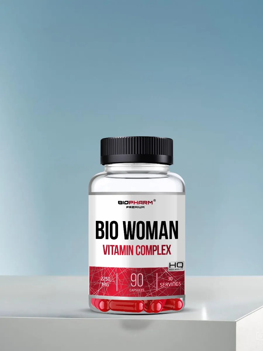 Bio Woman by BioPharm is a comprehensive multivitamin complex designed specifically to support women's health and beauty. It contains vitamins A, D3, E, C, and B vitamins, as well as biotin and curcumin.