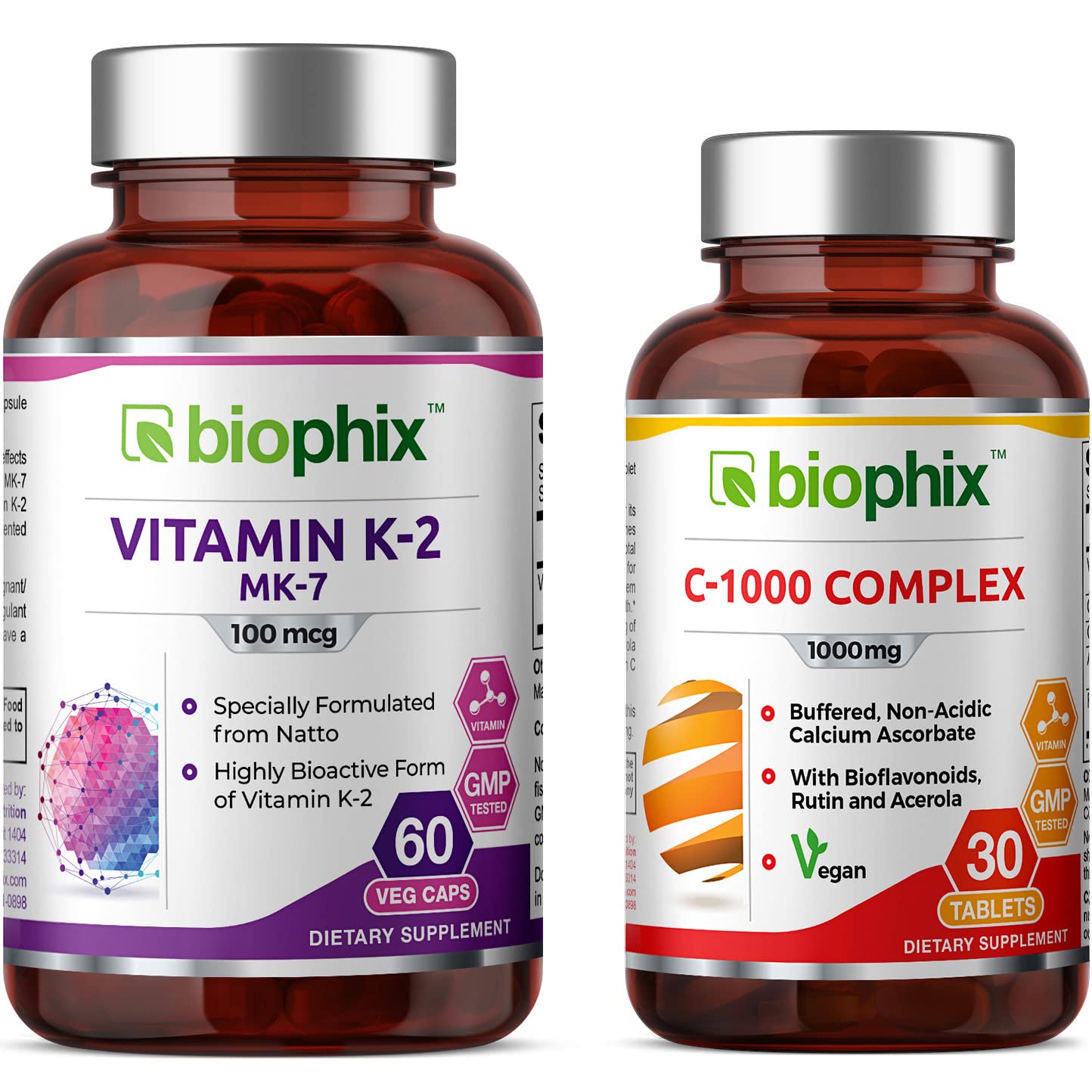 biophix Vitamin K2 MK-7-100 mcg 60 - Free Vitamin C-1000 30 Tablets - Supports Strong Bones Immune Health