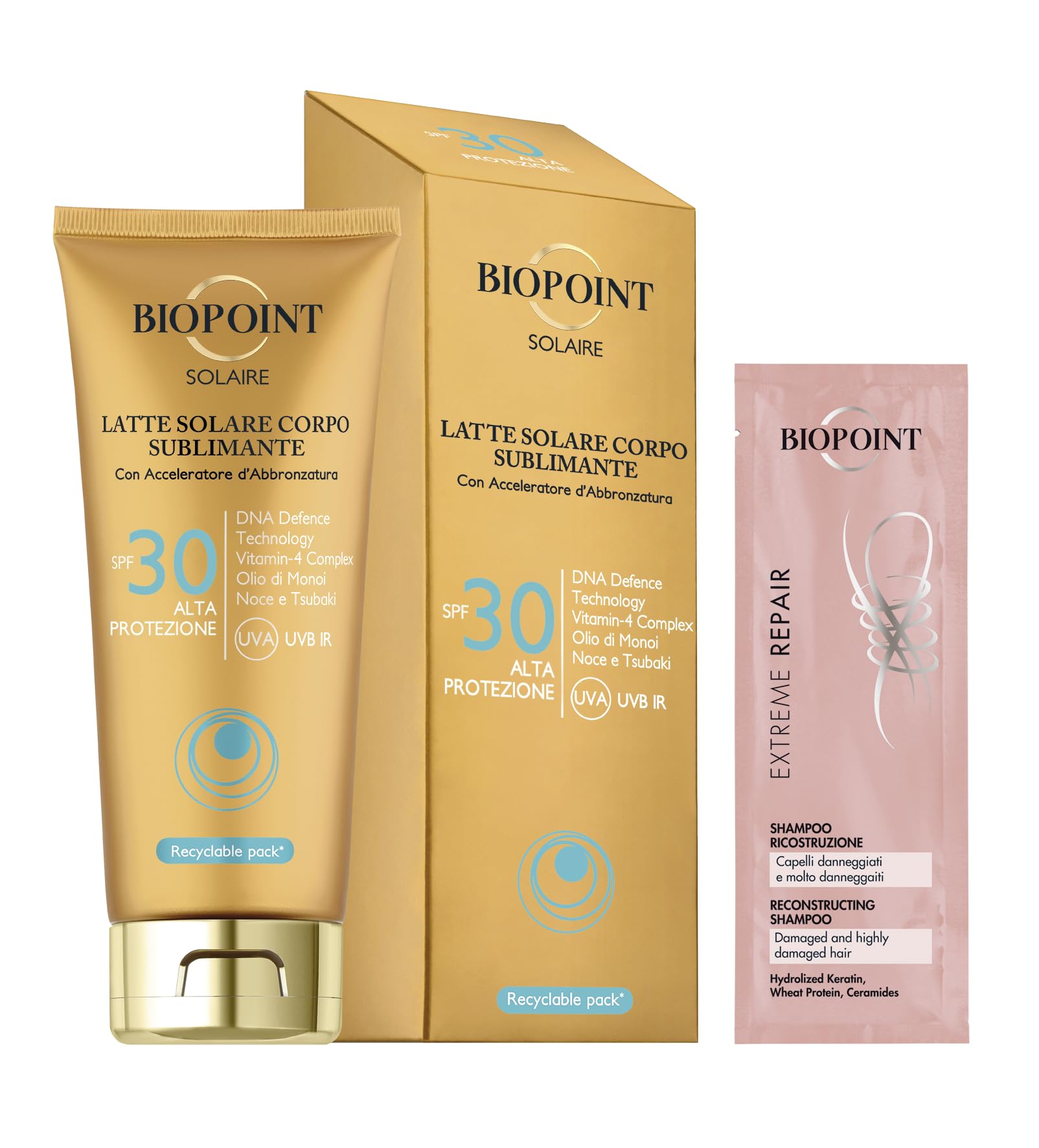 BIOPOINT Biopoint Solaire - Sublimating Sun Lotion SPF 30 with Tanning Accelerator Antioxidant and Moisturizing Action 200 ml with Champion Extreme Repair Shampoo 10 ml