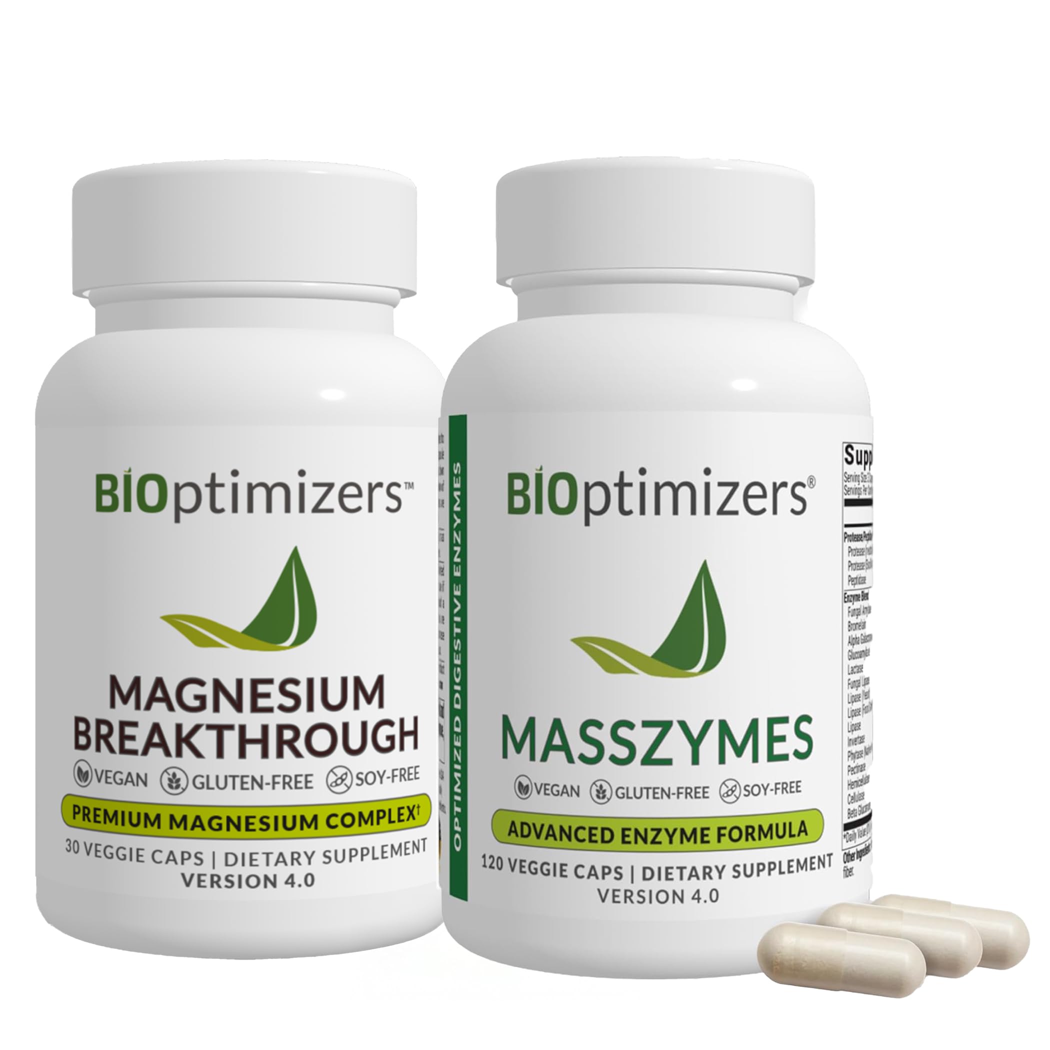 BiOptimizers Magnesium Breakthrough 4.0, (30 Capsules) & MassZymes 4.0, (120 Capsules) - Natural Sleep, Brain, and Digestive Health Support Supplement Bundle
