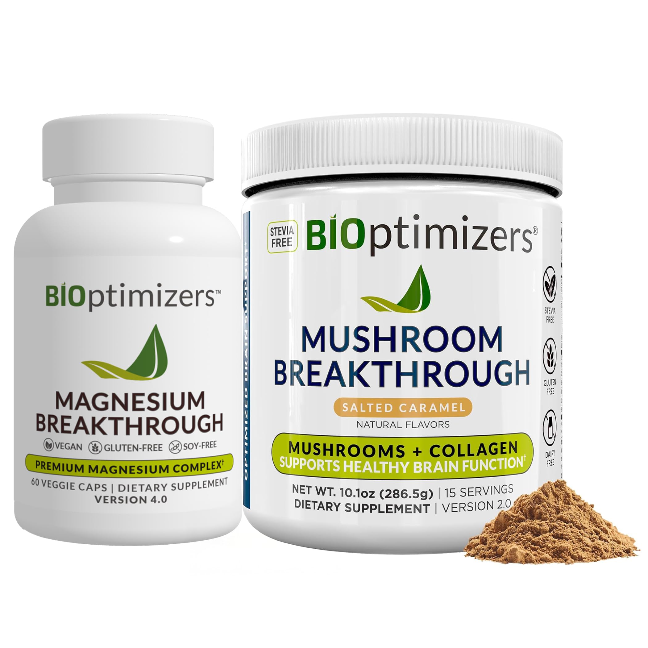 BiOptimizers Magnesium Breakthrough 4.0, (60 Capsules) & Mushroom Breakthrough Powder (Salted Caramel, 15 Servings) - Natural Sleep and Brain Superfood & Supplement Bundle