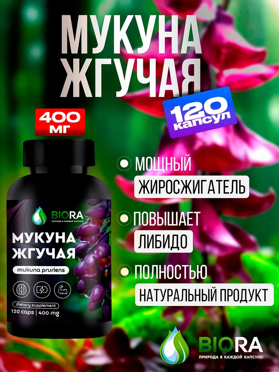 Мукуна жгучая: также исследуется для ее надежного применения в области мужского здоровья, в частности, для поддержания здоровой эрекции и повышения уровня тестостерона. Капикаччу входит в состав аюрведических рецептов и современных спортивных добавок, для улучшения восстановления организма после физической активности, для эффективного жиросжигания и похудения, а также для набора мышечной массы. Мукуна считается одним из самых популярных растений Африки и Тропической Азии, которое используется в пищевых и лекарственных целях. Это растение относится к семейству бобовых и является многолетним вьющимся кустарником с побегами до 15 метров в длину. Самым главным компонентом травяного сбора Мукуны является L-Dopa. Наибольшая концентрация находится в зрелых семенах - 3,1 - 6,1% . Вещество является прекурсором Дофамина - важнейшего нейромедиатора. Дофамин — это нейромедиатор, он ответственный за мотивацию и то самое ощущение, которое приходит к нам с достижением успехов. Другими словами, дофамин даёт нам начальный заряд, подталкивающий нас к достижению целей, а потом повышает последующее чувство удовлетворённости. При пониженном уровне дофамина могут наблюдаться разные нарушения деятельности ЦНС, в том числе и нейродегенеративные заболевания. Мукуна Жгучая ноотроп может применяться для следующих целей: - Восстановление при физической и умственной переутомляемости - При избавлении от тревожности и депрессивных состояний - снижение холестерина и сахара в крови, очищение организма от лишнего веса, для омоложение и здоровья кожи. Повышение Потенции у мужчин и либидо у женщин, сохранением мужского и женского здоровья. Форма выпуска: 120 капсул по 400 мг. Рекомендации к применению: 2-4 капсулы в первой половине дня, запить водой или соком. Курс 3-4 недели, затем желательно сделать перерыв 1-2 недели и по необходимости повторить курс. Противопоказания: Не обнаружено, но следует принимать осторожно из-за сильного действия. Не рекомендуется принимать во время беременности и во время грудного вскармливания, детям до 12 лет, людям с личной непереносимостью компонентов. Наш товар подойдет как подарок на день рождения маме и папе, на юбилей мужчине и женщине, просто порадовать витаминами для нервной системы мужа и жену, сестру, брата, парня и девушку. Не является БАД, не является лекарственным средством.