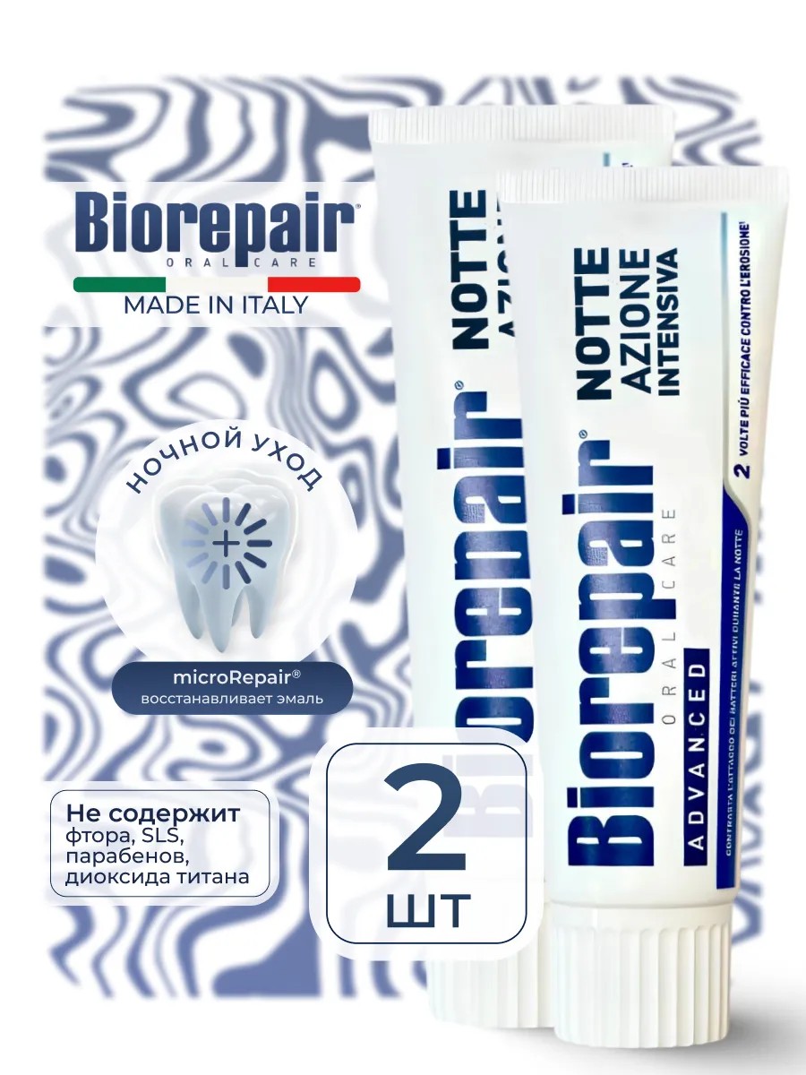 Зубная паста biorepair Advanced Notte Azione Intensiva, 75 мл (набор 2 штуки) – специально разработана для защиты зубной эмали в ночное время, когда процесс деминерализации особенно активен.