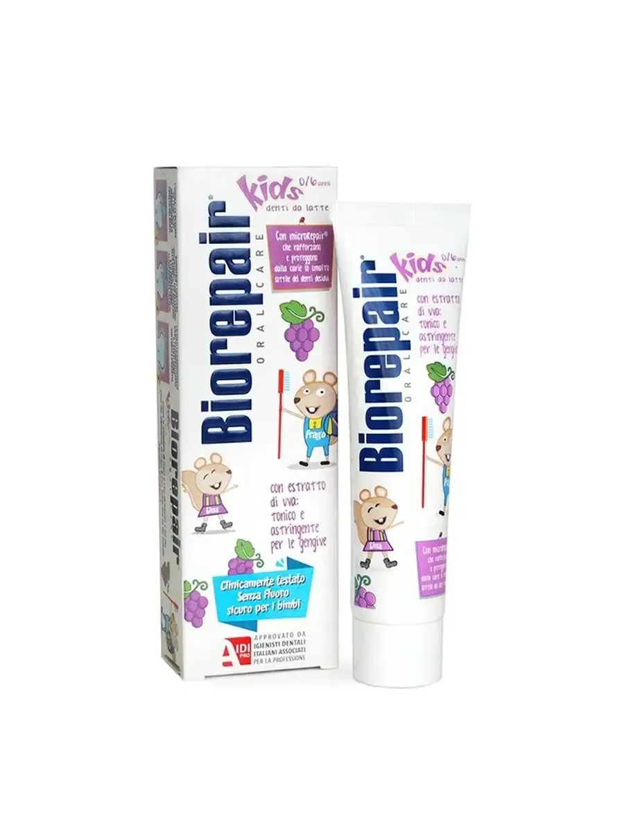 Biorepair Kids toothpaste will restore and reliably protect children's tooth enamel from harmful acids and sugar. Grape extract tones and strengthens gums, easing the teething process.