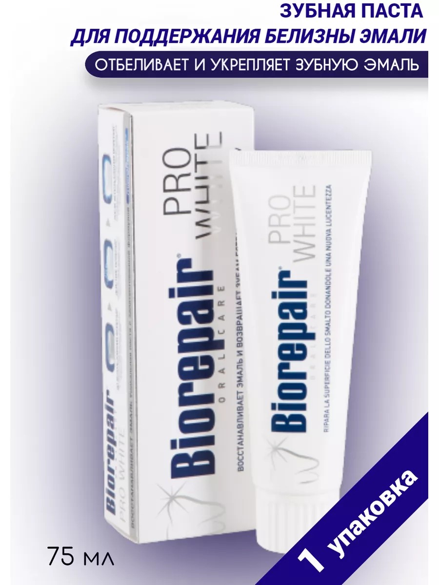 Biorepair зубная паста для поддержания белизны эмали - это средство, созданное для улучшения состояния и эстетического вида зубной эмали. Заботится о деснах и защищает полость рта, благодаря наличию антибактериальных компонентов в своем составе. Отбеливающая зубная паста для домашнего использования, для ежедневного применения. Бережно очищая зубы, Biorepair устраняет налет и предотвращает образование зубного камня, обеспечивая свежесть на длительное время. Эта зубная паста обладает легкой консистенцией, не содержит агрессивных компонентов и прекрасно подходит для ежедневного использования.Уникальная формула зубной пасты не только отбеливает, но и одновременно укрепляет зубную эмаль. Она сочетает в себе действие наночастиц microRepair с запатентованным активным полимером PVP. MicroRepair — биометрические и биосовместимые частицы, созданные из кристаллов гидроксиапатита, аналогичных эмали. Гидроксиапатит — это главный компонент зуба, составляющий 90% зубной эмали и 70% дентина. Частицы MicroRepair имеют способность к восстановлению эмали и дентина, они глубоко проникают в микротрещины и повреждения, укрепляют и защищают поверхность зубов. Снижают повышенную чувствительность эмали за счёт запечатывания открытых дентинных канальцев.Полимер PVP образует тонкий защитный нанослой на поверхности зубов, который защищает их от воздействия красящих веществ, таких как кофе, сигареты, красное вино, препятствует образованию зубного налёта.Рекомендована для комплексной профилактики кариеса и для поддержания белизны зубов, идеальна после процедуры отбеливания.Аллергических реакций в ходе клинических исследований не выявлено. Рекомендовано использовать с 12 лет.
