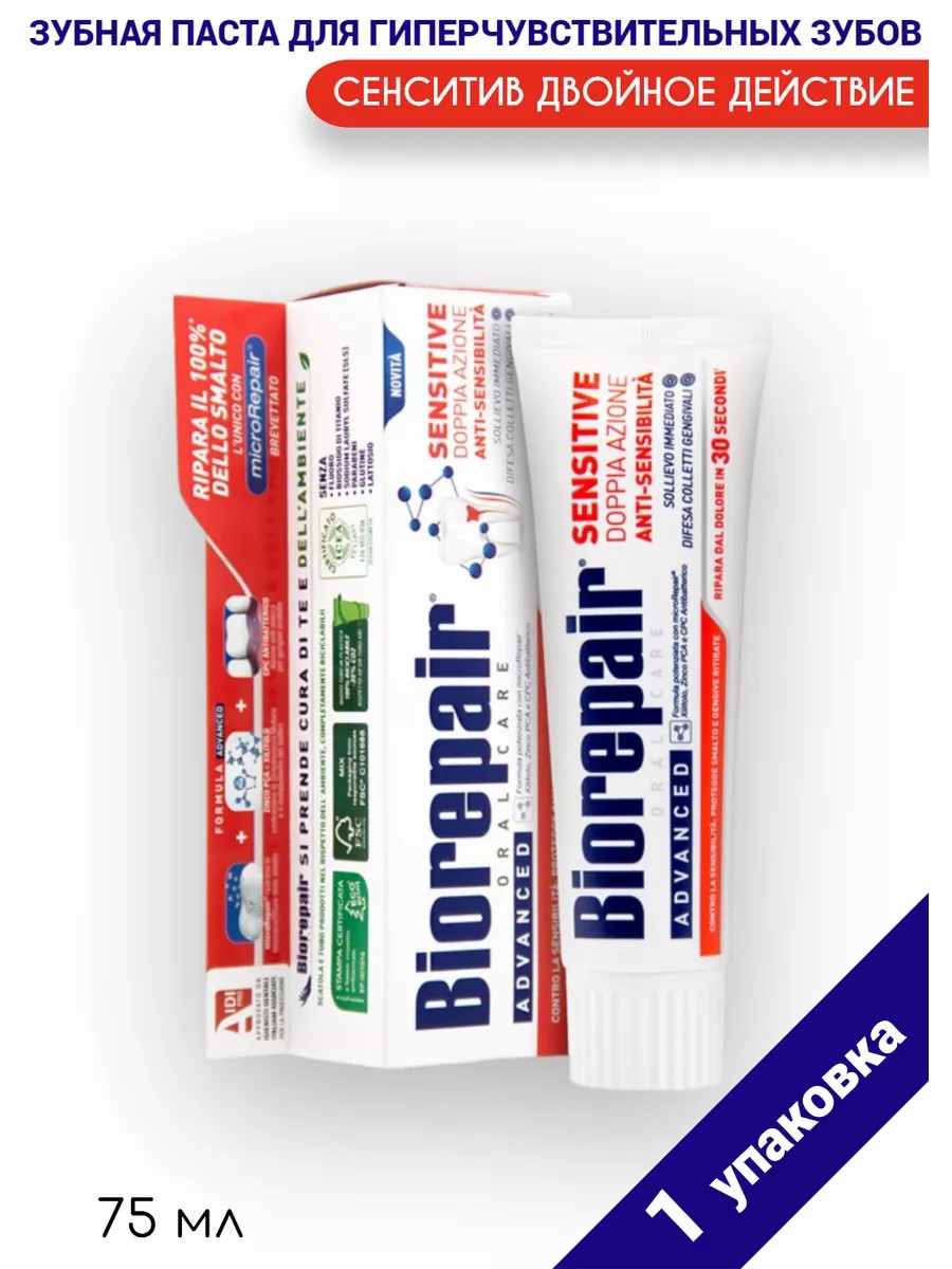 Зубная паста Biorepair Sensitive Double Action разработана специально для снижения гиперчувствительности зубов: вы можете употреблять сладкую, горячую или холодную пищу без неприятных ощущений.Biorepair Sensitive Double Action восстанавливает эмаль при помощи уникальных частиц microRepair. Их состав идентичен природному гидроксиапатиту, из которого состоят эмаль и дентин. Благодаря своей игольчатой структуре microRepair встраиваются в зубную эмаль, заполняя микротрещины, восстанавливают ее и делают гладкой. Всего за 30 секунд образуется прочный защитный слой, который глубоко запечатывает открытые дентинные канальцы и избавляет от боли.Комплекс с антибактериальным компонентом СРС antibatterico (цетилпиридиния хлорид) борется с бактериями, которые способствуют формированию налета на линии десны и сохраняет десны крепкими и плотными.Сочетание таких компонентов, как цинковая соль пирролидонкарбоновой кислоты (Zink PCA) и ксилит, оказывает мощное антибактериальное действие. Данные компоненты негативно воздействуют на метаболические процессы бактерий, что в свою очередь приводит к снижению концентрации Steptococco Mutans - основной причины образования кариеса.Не содержит фтор, диоксид титана, SLS, парабены, глютен и лактозу.