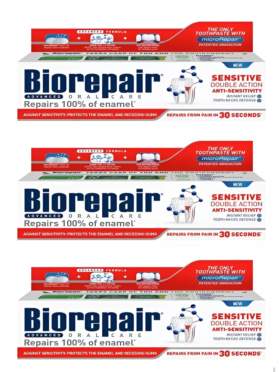 BIOREPAIR Зубная паста сенсетив двойное действие восстанавливает естественный барьер чувствительности благодаря действию частиц Microrepair, формирующих защитный слой на поверхности дентина.