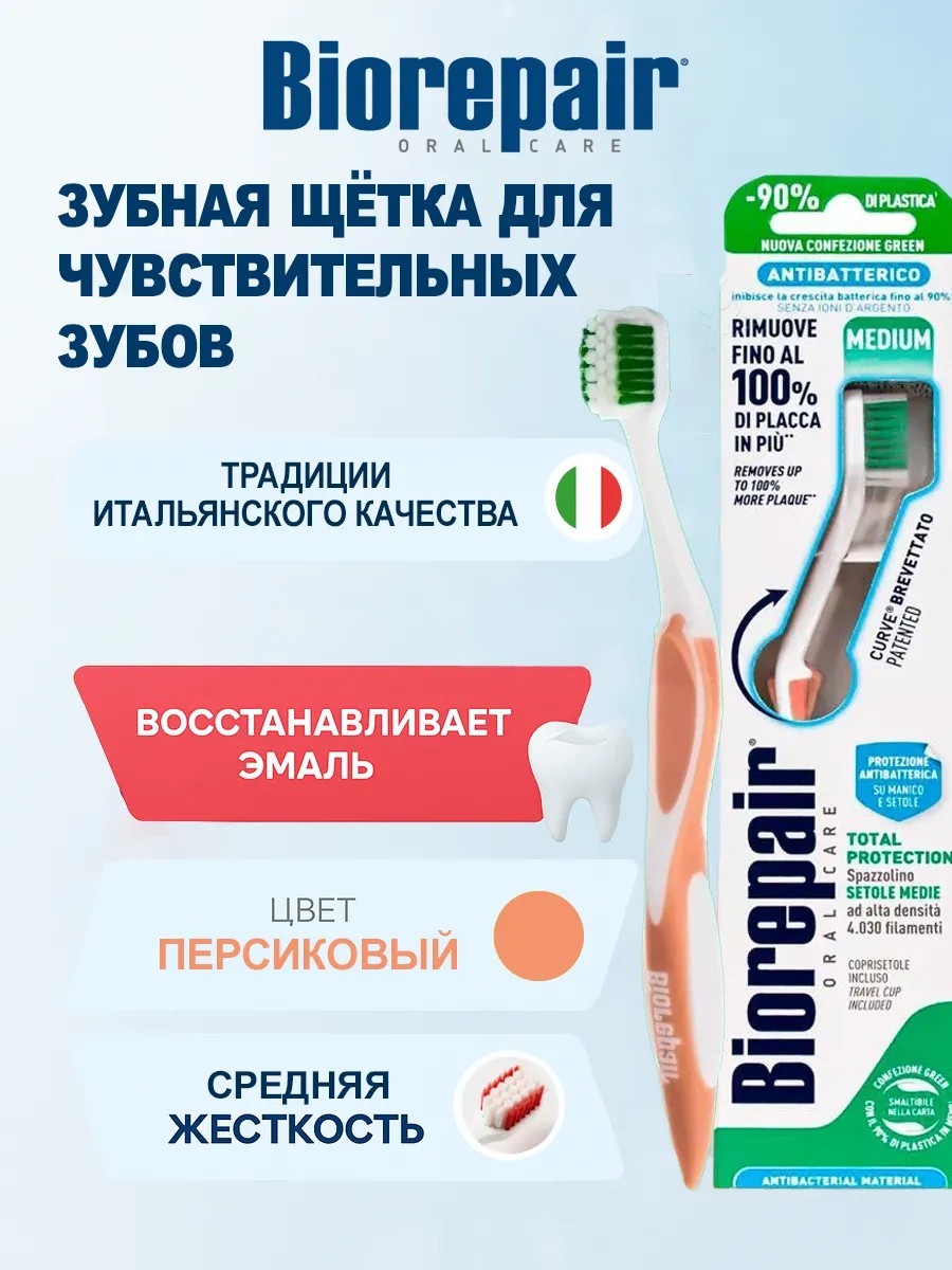 Biorepair Total Protection Medium зубная щетка Аксессуары Biorepair обладают уникальным самоочищающимся полимером SVP, способным отталкивать бактерии в течение нескольких недель. Аксессуары идеально дополняют выбранные зубные пасты Biorepair. Обладают ассоциативно понятными цветами для потребностей, связанных с полостью рта. Основные функции Total Protection Medium: Обеспечивает доступ к любому месту в полости рта; Восстанавливает эмаль; Препятствует размножению бактерий, благодаря обработке самоочищающимся полимером SCP; Качественное и бережное удаление налета с поверхностей зубов. Рекомендована: Для ежедневного ухода за полостью рта; Для профилактики кариеса; Для удаления налета с поверхности зубов; Для взрослых и детей старше 14 лет. Содержит 4030 щетинок (это в 4 раза выше, чем у стандартных щеток).