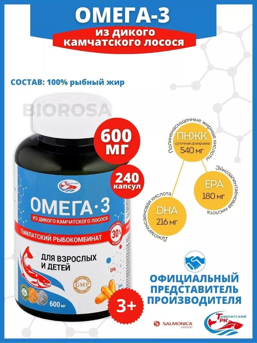 Омега-3 в капсулах от Тымлатского рыбокомбината камчатский натуральный высокой концентрации и степени очистки , произведенный из дикой рыбы ценных сортов. Витаминный комплекс (камчатка) высшего качества из рыбного жира содержит в себе незаменимые полиненасыщенные жирные кислоты: ЭПК ( эйкозапентаеновая кислота , EPA ) и ДГК ( докозагексаеновая кислота , DHA ). В суточном приеме омега-3 600 мг.содержится: ПНЖК Омега-3 - 540 мг. Эйкозапентаеновая кислота (EPA) - 216 мг. Докозагексаеновая кислота (DHA) - 180 мг. Докозагексаеновая кислота dha 216 мг. Омега 3 халяль отлично усваивается , а значит эффективнее других омег из обычной рыбы мелких пород. Биологические добавки , такие как Рыбный жир добывают из мышечной ткани. Такой продукт является более чистым и безопасным. А рыбий жир из её печени , является источником не только витаминов , но и вредных токсинов , которые рыба накапливает на протяжении жизни. Омега - это одна из базовых добавок здорового образа жизни в любом возрасте детские и взрослые. Omega3 ( комплексные витамины и минералы для женщин omega 3 ) подходит детям с 12 лет , для девушек , мужчин и спортсменов. Насыщает организм витаминами A и D , что поддержит здоровье сердца при сердечно-сосудистых заболеваниях и для похудения. Понижает уровень «плохого холестерина» (липопротеиды низкой плотности) , который в избытке приводит к развитию атеросклероза и поражению сосудов. Обладает противовоспалительным эффектом и нормализует работу сальных желез , что помогает в устранении прыщей , проявлений аллергии и кожных заболеваний. Защищает кожу от чрезмерного воздействия ультрафиолетовых лучей , что актуально в пляжный сезон и для частых посетителей солярия. БАДы Рыбный жир ( не рыбий жир ) - это улучшение работы мозга ( для памяти ) и уменьшение воспаления. А также его называют витамин от стресса - это чистая энергия. Однако человеческий организм не может вырабатывать ПНЖ кислота самостоятельно , поэтому важно получать их из пищевых источников. Если вы ищете высококачественный источник омега для беременных и для лактации - то вам обязательно стоит попробовать продукцию бренда Salmonica. Наша компания признана одним из ведущих производителей рыбной продукции в России вообще и в регионе в частности. Это означает , что вы можете наслаждаться всеми преимуществами Омега3 для здоровья. БАД для суставов подходит для взрослых и детей (для роста ) , не содержит сахара и ГМО. Витаминные комплексы женские - капсулы желатиновые с кислотами рекомендован при дефиците в организме жирных кислот , вызванном диетами , вредными привычками , неправильным питанием , стрессом. Показания: слабый иммунитет , ломкие волосы и ногти , сухая кожа. Прием капсул омега3 улучшает общее самочувствие, умственную работоспособность, оказывает благоприятное воздействие на сердечно - сосудистую систему , помогает справиться с сезонными депрессиями и выровнять психоэмоциональное состояние. Детям омега3 необходим для роста костей , умственного развития , концентрации внимания , поддержания иммунитета , бад для глаз и кожи лица. Если вы ищете надежный источник полиненасыщенных жирных кислот , то продукты из дикого лосося для укрепления волос определенно стоит попробовать. Наша приверженность качеству и натуральным ингредиентам гарантирует крепость костей женское , и что вы получите максимальную питате