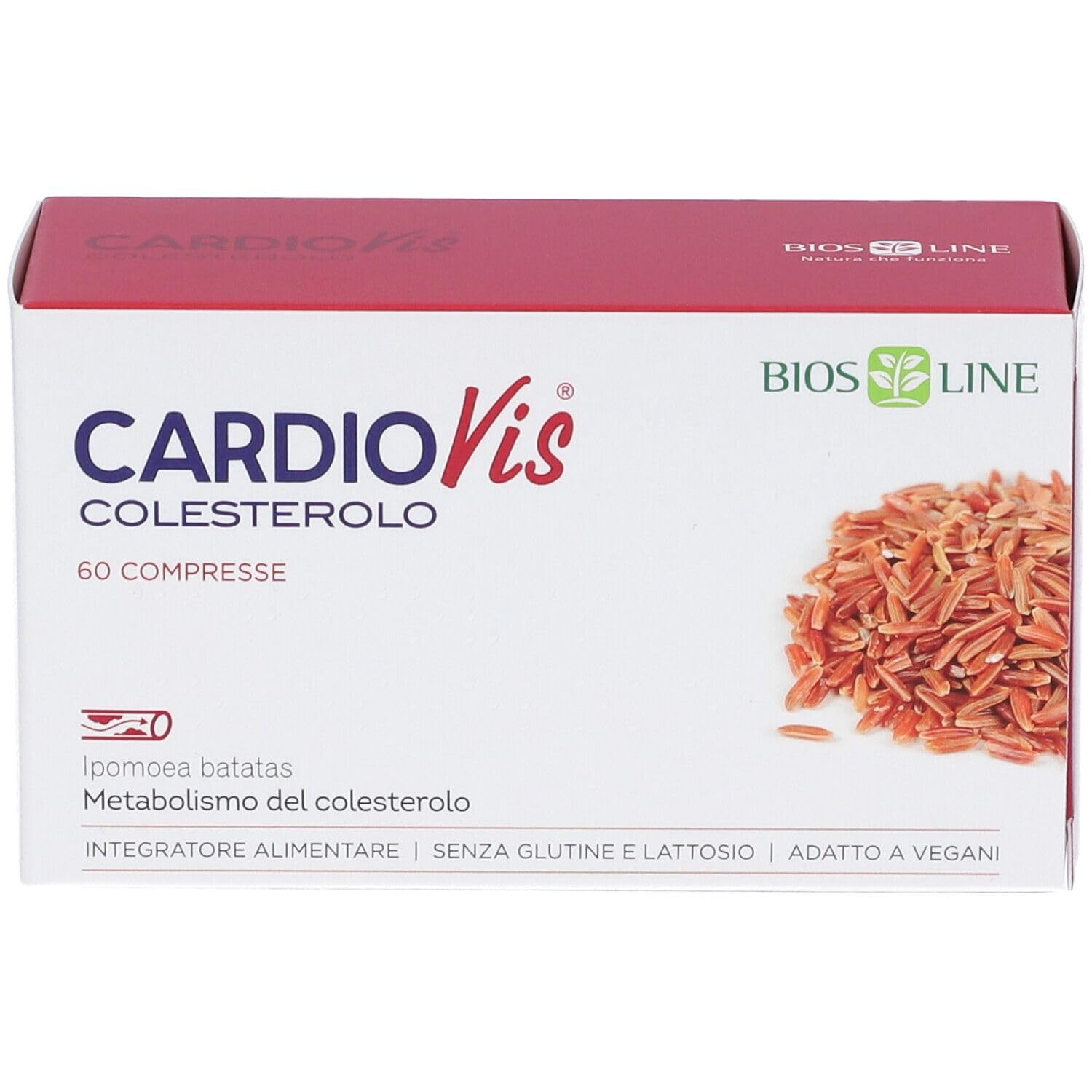 CardioVis Cholesterol 60 Capsules Biosline 3 Product Type: Herbal Supplement Size: 60 Units Pack of 3 INGREDIENTS Bulking Agent: Cellulose American Potato (Ipomoea batatas (L.) Poir) Tuber Extract, Rice (Oryza sativa L.) Fermented with Monascus purpureus Went. Tit. 3 Total Monacolin, Mandarin (Citrus reticulata Blanco) Pericarpo Extract Tit. 60 Polymethoxyflavones, Eidrosol Blend of: Olive (Olea europaea L.) Fruit Extract Tit. 12 Hydroxytyrosol and Vitamin E (DL-Alpha Tocopheryl Acetate) Anti-caking Agents: Silicon Dioxide, Magnesium Salts of Fatty Acids Coating Agents: hydroxypropylmethylcellulose, polyethylene glycol flavourings, sweetener: sucralose, coenzine Q10.