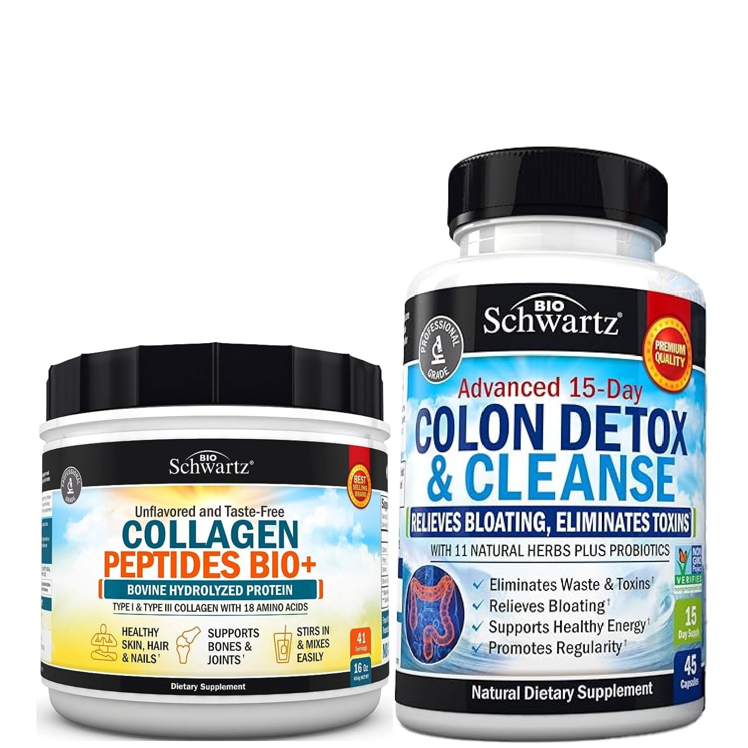BioSchwartz 15 Day Cleanse for Colon and Gut Health Plus Hydrolyzed Collagen Peptides Powder (40+ Servings)