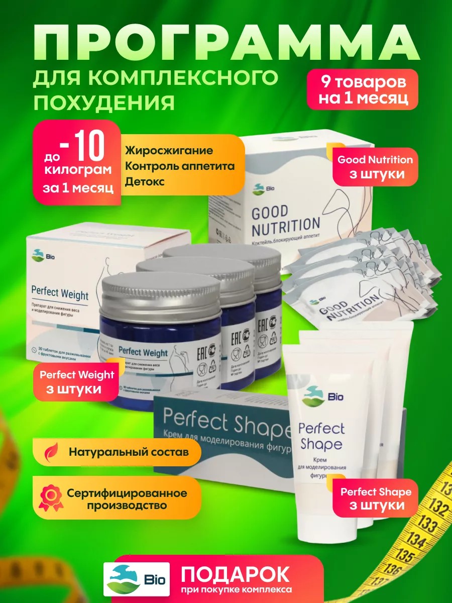 | Комплектация | Perfect Weight 3 упаковки по 30 таблеток; Good Nutrition 3 упаковки по 20 саше; Perfect Shape 3 упаковки по 50 мл; подарок |