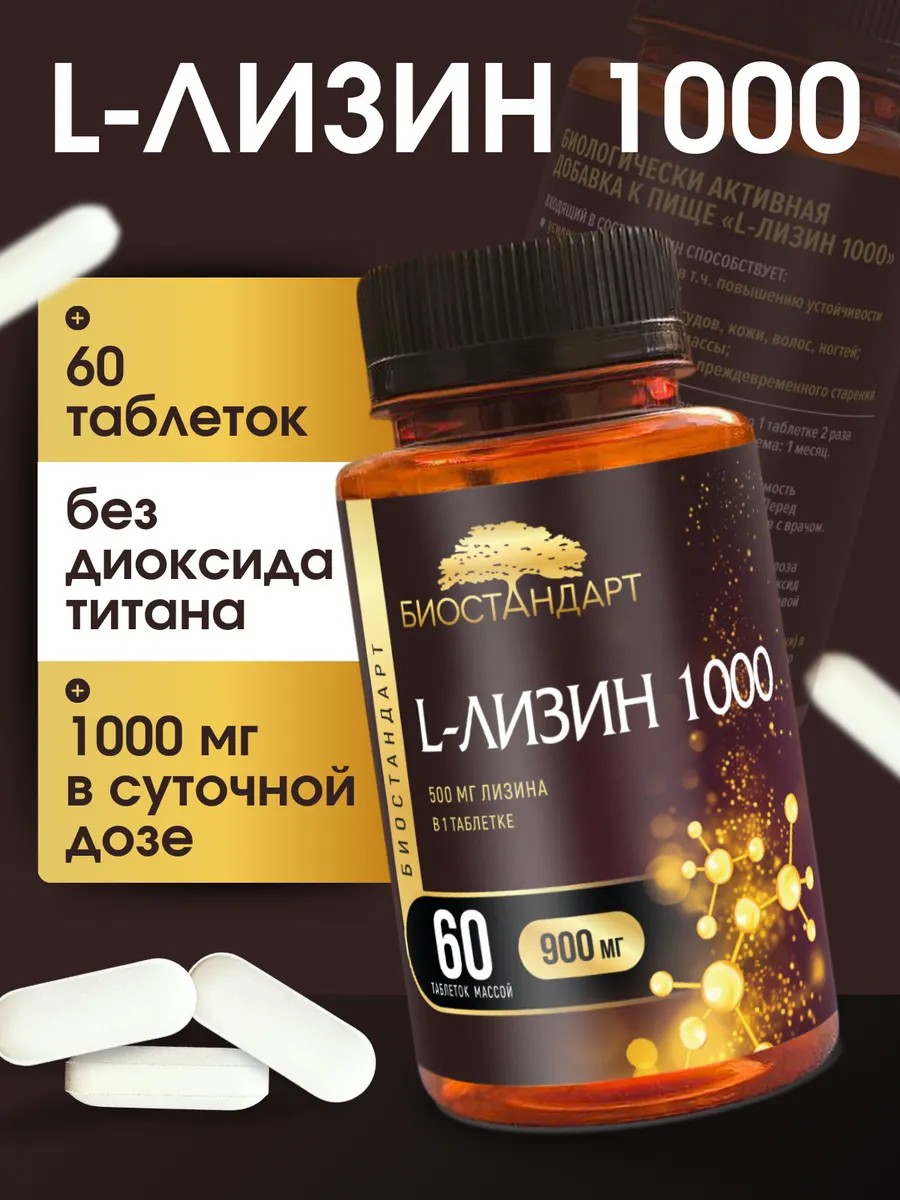 Биостандарт L-лизин 1000, аминокислота lysine, 60 таблеток