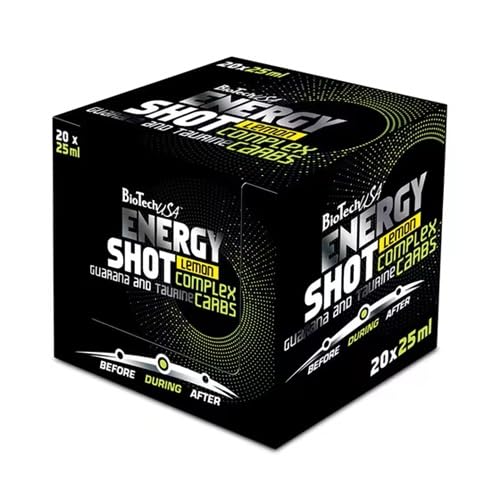 1 serving contains: over 10g of carbohydrates from various sources, 1000mg of L-arginine, 1000mg of taurine, 125mg of guarana extract, green tea leaf extract, inositol, and glucuronolactone. Comes in a convenient, lemon-flavored packet. Recommended before and during workouts. A liquid formula containing a combination of carbohydrates (glucose, fructose, maltodextrin, and D-ribose) and added amino acids (taurine, L-tyrosine, L-citrulline, and L-arginine). The product is also enriched with plant extracts, including guarana seed and green tea, two well-known natural sources of caffeine. Energy Shot also contains magnesium, which contributes to the reduction of tiredness and fatigue, electrolyte balance, normal energy-yielding metabolism, and normal muscle function.BioTechUSA Energy Shot Citron 20 x 25 mlDESCRIPTION DU PRODUIT 1 portion contient : plus de 10 g de glucides provenant de diverses sources, 1 000 mg de L-arginine, 1 000 mg de taurine, 125 mg d'extrait de guarana, extrait de feuille de thé vert, inositol et glucuronolactone. Livré dans un petit emballage pratique, aromatisé au citron. Recommandé avant et pendant les séances d'entraînement. Une formule liquide contenant une combinaison de glucides (glucose, fructose, malle todextrine et D-ribose) et acides aminés ajoutés (taurine, L-tyrosine, L-citrulline et L-arginine). Le produit est également enrichi en extraits de plantes, y compris les graines de guarana et le thé vert, deux sources naturelles bien connues de caféine. Energy Shot contient également du magnésium qui contribue à réduire la fatigue et la fatigue, l'équilibre électrolytique, le métabolisme énergétique normal et la fonction musculaire normale.