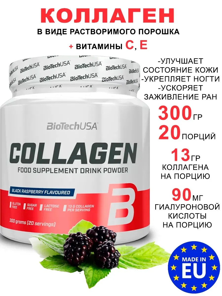 Фактически Collagen от BioTechUSA обеспечивает гиалуроновой кислотой и коллагеном одновременно. В нем содержится добавленный витамин С, который способствует выработке коллагена самим организмом, что в конечном счете помогает сохранить здоровье вашей кожи, кровеносных сосудов, костей, хрящей, зубов и десен. Содержащийся в этом продукте витамин Е играет важную роль в защите клеток против окислительного стресса.