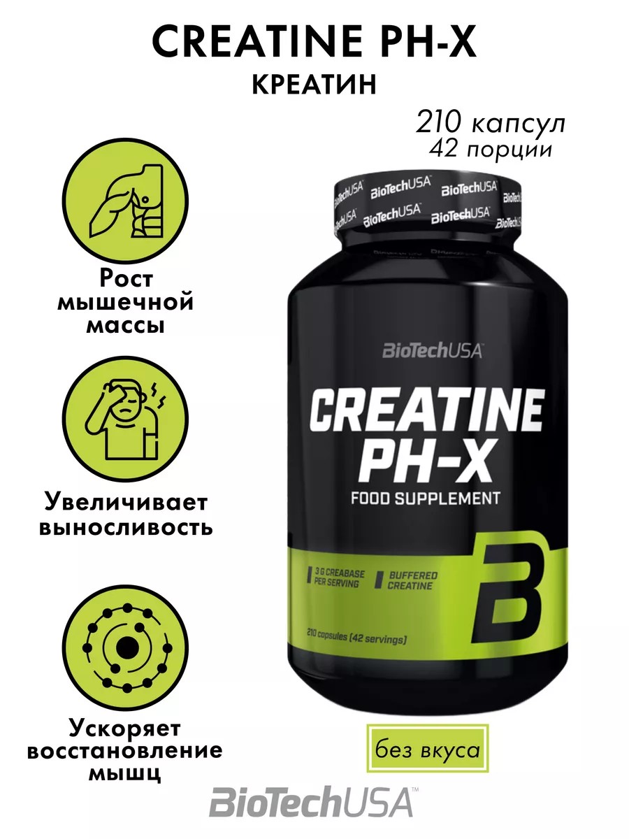 Торговое наименованиеБиологически активная добавка к пище BioTechUSA «Креатин ПиАш-Икс» («Creatine PH-X») в банках от 90 капс. до 210 капс.