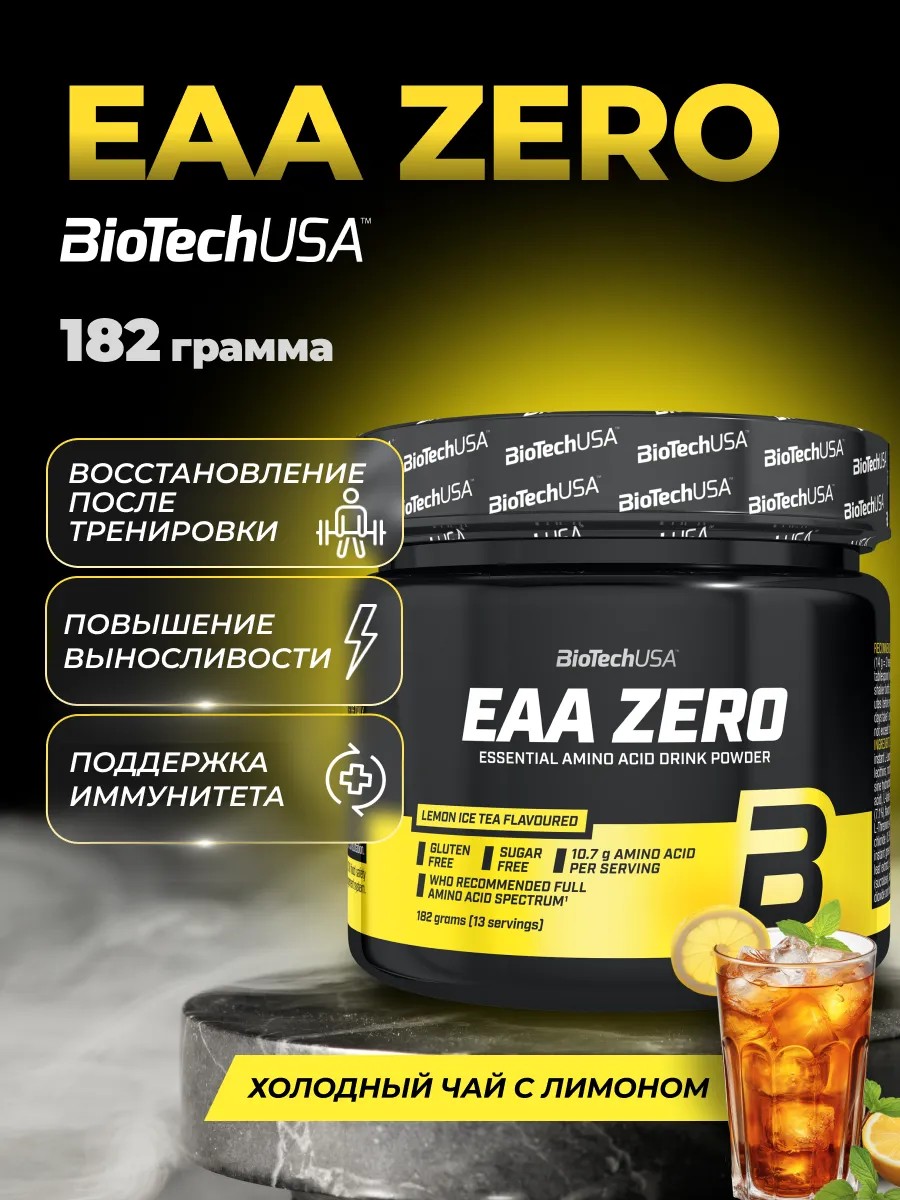 Cодержание незаменимых аминокислот 7 160 мг, близкое к 1:1 соотношение глутамина и BCAA, без сахара, без глютена. Соотношение различных незаменимых аминокислот в этом продукте соответствует рекомендации Всемирной организации здравоохранения (WHO). Как и все продукты BioTechUSA, EAA Zero разработан с оптимальным составом. Поэтому EAA Zero содержит все незаменимые аминокислоты в оптимальном соотношении, рекомендованном Всемирной организацией здравоохранения. При обновлении EAA Zero мы не только стремились получить правильные пропорции, но и также поставили своей целью создать комплексный продукт. В результате теперь продукт содержит все незаменимые аминокислоты, а за счет добавления глутамина мы дополнительно увеличили количество аминокислот, необходимых для наращивания мышц. EAA Zero обеспечивает специальную комбинацию аминокислот, которую вы можете выпить, не испытывая чувство вины, даже если вы соблюдаете диету, поскольку этот продукт не содержит сахара. Насладитесь вкусом лимона и синего винограда до или даже во время изматывающей тренировки. Как и все продукты BioTechUSA, EAA Zero изготовлен из безопасных для здоровья и тщательно отобранных ингредиентов.