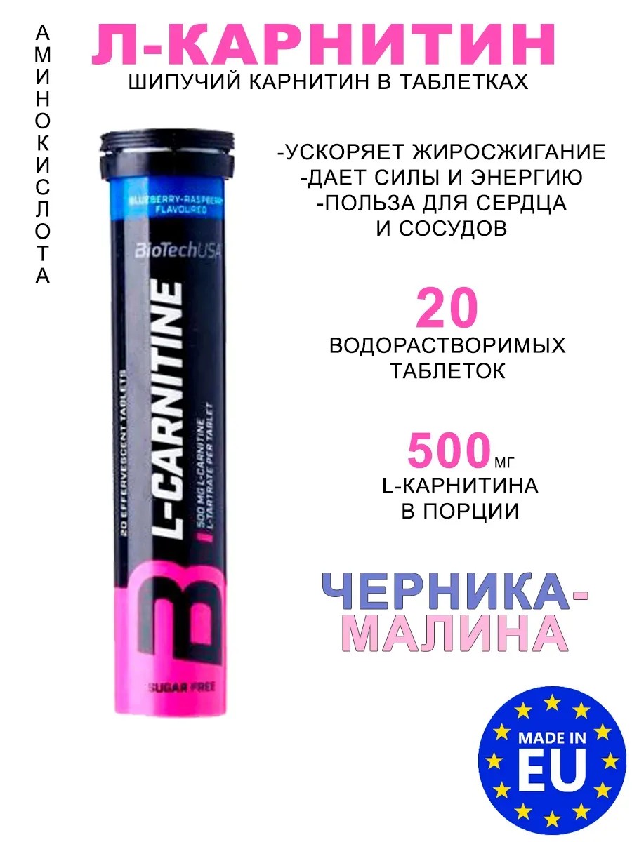 BioTech L-Carnitine 500mg шипучий карнитин в таблетках. Добавление карнитина приводит к повышению выносливости организма, улучшению функции сердца, уменьшению подкожного жира, более быстрому восстановлению за счет общего улучшения обменных процессов в клетках. Очень быстро растворяется в воде.