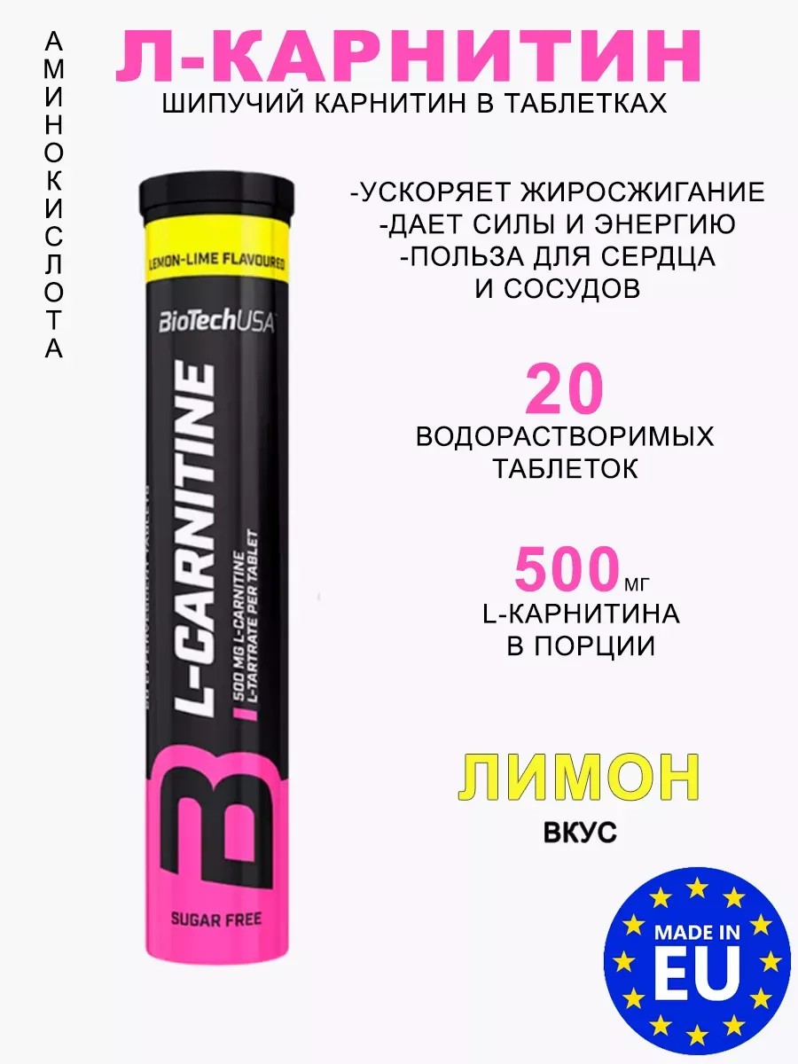 BioTech L-Carnitine 500mg шипучий карнитин в таблетках. Добавление карнитина приводит к повышению выносливости организма, улучшению функции сердца, уменьшению подкожного жира, более быстрому восстановлению за счет общего улучшения обменных процессов в клетках. Очень быстро растворяется в воде.