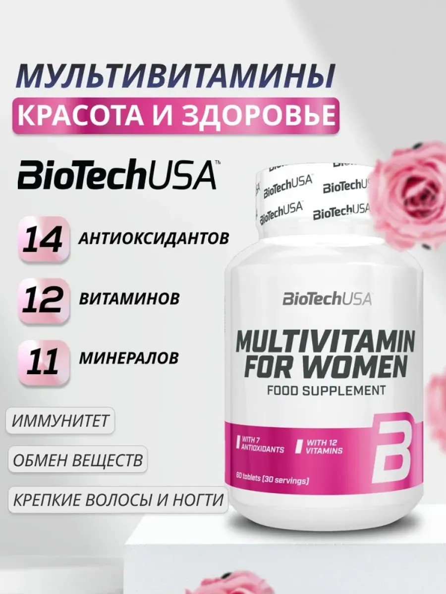 BENEFITS from Multivitamin for Women BiotechUSA • strengthens the immune system • improves metabolism and digestive function, • supports brain and nervous system function, • increases stress resistance, provides additional strength and energy, • increases the effectiveness of protective and restorative processes, • prevents premature aging, • maintains vitality, • improves skin tone and elasticity • removes harmful metabolic products from the body, • strengthens the structure of nails, hair and teeth, • blocks the synthesis of free radicals (damaging molecules).