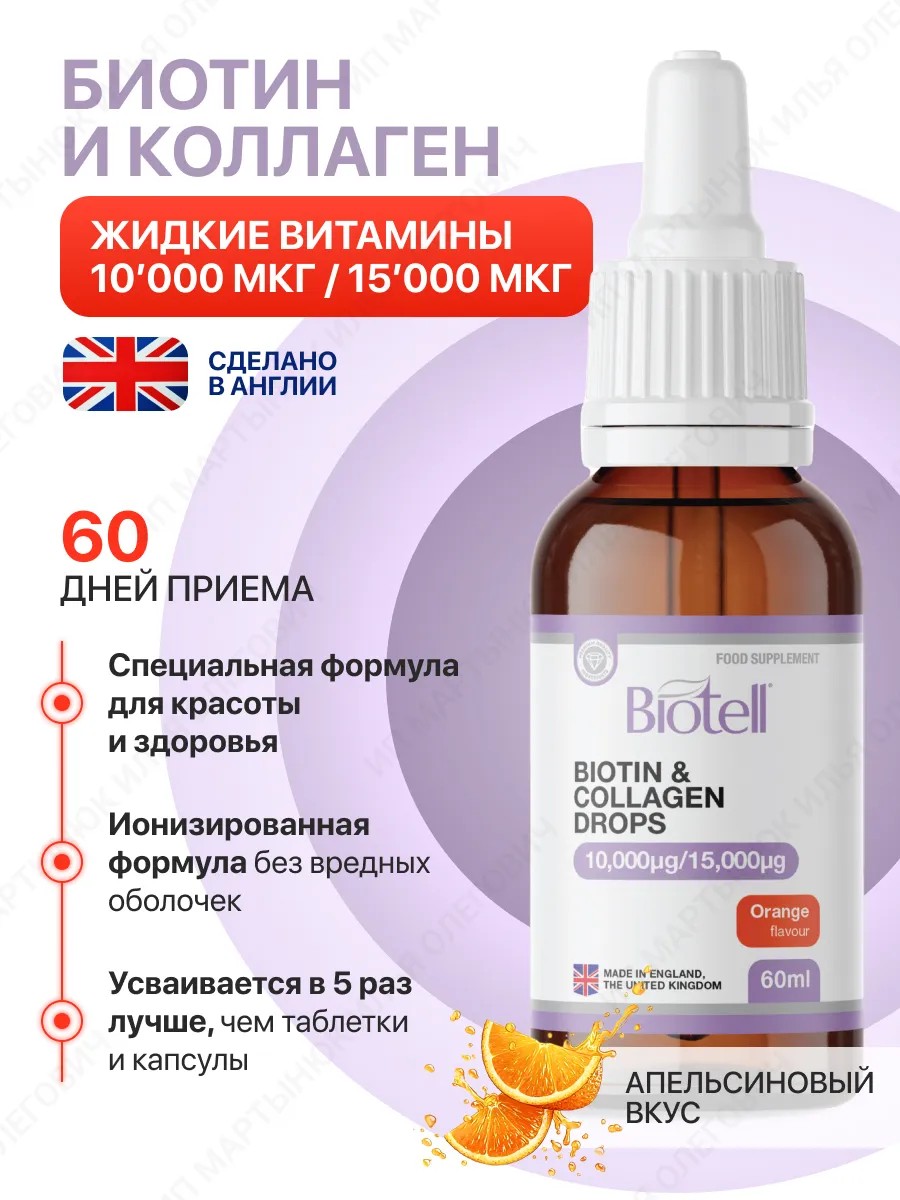 Жидкие премиальные витамины Biotell Биотин и коллаген с апельсиновым вкусом - это гарантия эффективности от лучшего британского производителя. Гарантированные чистота, качество и эффективность от Британского бренда №1 идеально подходят для детей, беременных женщин и людей с повышенной чувствительностью. Жидкий витаминный комплекс биотин + коллаген обеспечивают мощную поддержку роста и здоровья волос, ногтей и кожи. БАД Жидкие витамины Biotell— это сочетание высокого качества, инновационных технологий и доверия профессионального сообщества. Витамины подходят для тех, кто заботится о своем здоровье и выбирает только лучшее. Познакомьтесь с уникальной формулой жидких витаминов Biotell Биотин и коллаген – премиального бренда из Великобритании, который определяет новые стандарты качества среди витаминных добавок. Это витамины уровня Pharmaceutical Grade, разработанные и произведенные прямиком из Лондона, где контроль качества превосходит международные стандарты. Перед применением нужно хорошо встряхнуть флакон.