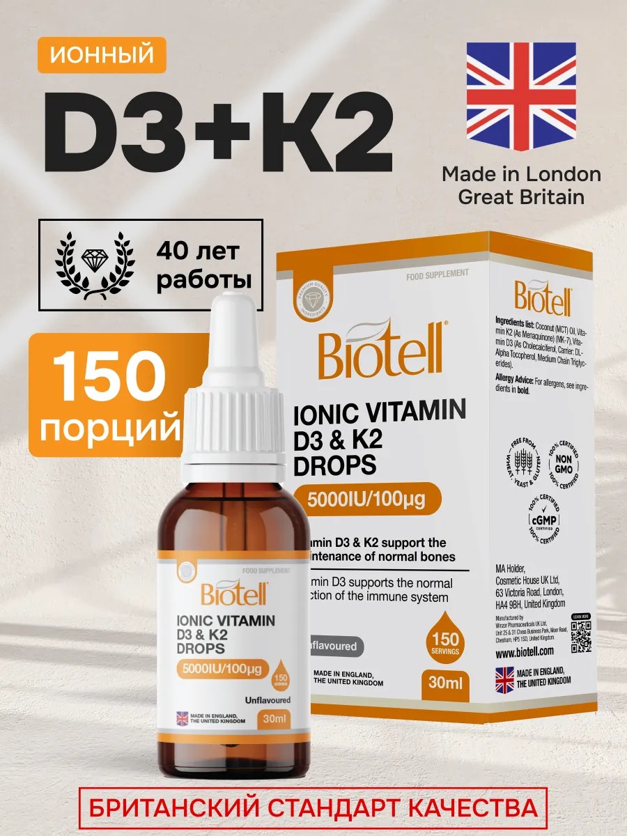 Познакомьтесь с уникальной формулой жидких витаминов Biotell D3+K2 – премиального бренда из Великобритании, который определяет новые стандарты качества среди витаминных добавок. Это витамины уровня Pharmaceutical Grade, разработанные и произведенные прямиком из Лондона, где контроль качества превосходит международные стандарты.
