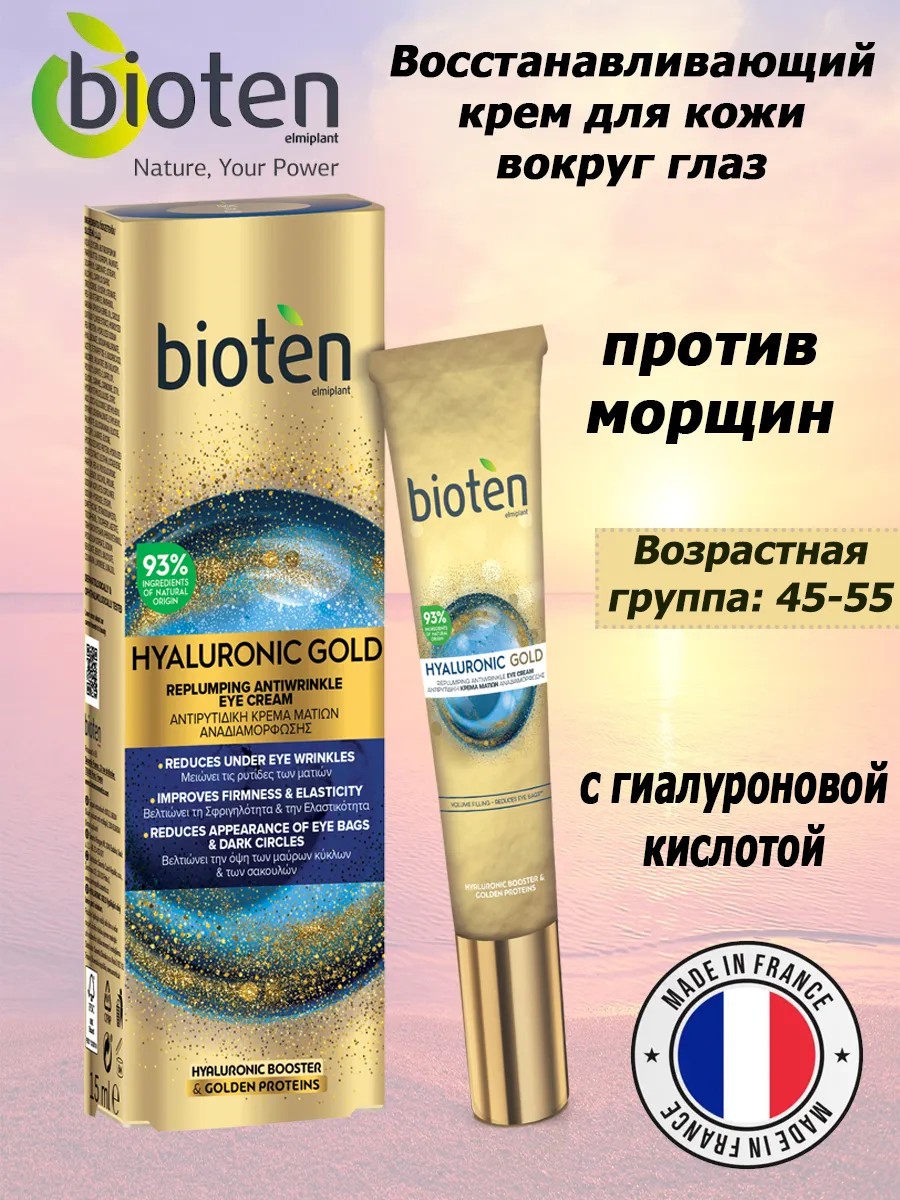Ваши глаза — это не только отражение ваших эмоций, но и важный элемент вашей красоты. Чтобы сохранить их молодость и свежесть, обратите внимание на антивозрастной крем для кожи вокруг глаз от Bioten. Этот уникальный продукт, созданный в сердце Франции и вдохновленный древнегреческими традициями ухода за собой, предлагает вам лучшее из двух миров. Bioten Hyaluronic Gold содержит 93 % ингредиентов натурального происхождения, что делает его безопасным и эффективным средством для борьбы с первыми признаками старения. Гиалуроновая кислота, входящая в состав, активно увлажняет кожу, делая морщины менее заметными, а протеины золота поддерживают ее эластичность и способствуют уменьшению возрастных изменений. После применения вы заметите, как кожа вокруг глаз становится свежей и отдохнувшей, а ваш взгляд — ярким и выразительным. Крем Биотен Гиалуроник Голд не только борется с морщинами, но и восстанавливает утраченный объем, уменьшает темные круги и припухлости под глазами. Благодаря уникальной формуле, включающей три вида гиалуроновой кислоты и девять миллионов капсул, он эффективно заполняет видимые морщины и улучшает цвет лица. Протеины золота, такие как полипептиды риса и горошка, способствуют синтезу гиалуроновой кислоты, что делает вашу кожу более упругой и молодой. Упаковка продукта изготовлена из переработанных материалов, что подчеркивает заботу бренда о природе и экологии. Этот крем станет не только отличным средством для ухода за кожей, но и идеальным подарком для близких, которые ценят качественную и эффективную косметику. Чтобы достичь наилучших результатов, комбинируйте Bioten Hyaluronic Gold с другими продуктами из этой линейки. Наносите крем по массажным линиям, избегая области роста ресниц. Если средство случайно попало в глаза, промойте их большим количеством воды. Выбирая антивозрастной крем Биотен Гиалуроник Голд для кожи вокруг глаз, вы делаете шаг к сохранению своей молодости и красоты. Позвольте вашим глазам сиять! Возрастная группа 45-55.
