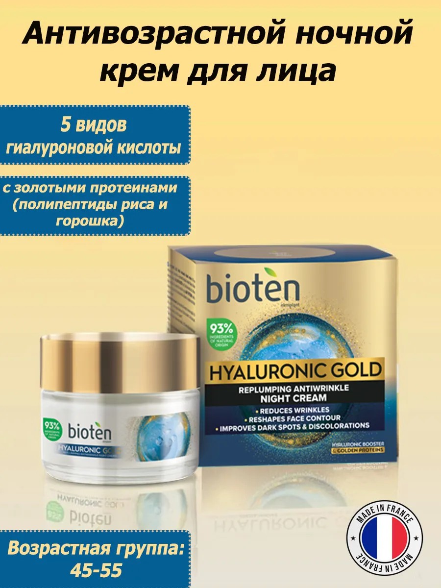 Откройте для себя секрет молодости и красоты с Bioten Hyaluronic Gold Ночным кремом против морщин. Этот уникальный продукт, созданный в сердце Франции и вдохновленный древнегреческими традициями, поможет вашей коже восстановиться и насытиться необходимыми питательными веществами во время сна.Ночь — это время, когда ваша кожа восстанавливается и обновляется, и именно в этот момент Bioten Hyaluronic Gold начинает действовать. Крем проникает глубоко в дерму, обеспечивая интенсивное увлажнение и смягчение. Его формула содержит 93% ингредиентов натурального происхождения, что делает его безопасным и эффективным для любого типа кожи. Гиалуроновая кислота, входящая в состав, активно увлажняет и поддерживает молодость кожи, а протеины золота укрепляют ее, придавая сияние и ровный тон. Вы заметите, как ваша кожа становится более упругой, а морщины и линии становятся менее заметными. Этот антивозрастной крем не только уменьшает проявления пигментации, но и выравнивает цвет лица, даря ему свежесть и ухоженный вид.Bioten Hyaluronic Gold Ночной крем против морщин обладает роскошной, шелковистой текстурой, которая мгновенно впитывается, обеспечивая исключительный комфорт. Наносите небольшое количество крема на очищенное лицо по массажным линиям за 30 минут до сна, и позвольте ему работать, пока вы отдыхаете.Для достижения максимальных результатов используйте этот крем в сочетании с Биотен Гиалуроник Голд. Вместе они создадут идеальный тандем для поддержания вашей кожи в безупречном состоянии на протяжении всего дня.Эта французская косметика станет отличным подарком для вас или ваших близких. Поддержите свою красоту и молодость с Биотен Гиалуроник Голд Ночным кремом против морщин — вашим надежным союзником в борьбе с возрастными изменениями кожи. Не упустите возможность преобразить свою кожу и вернуть ей сияние! Возрастная группа 45-55.