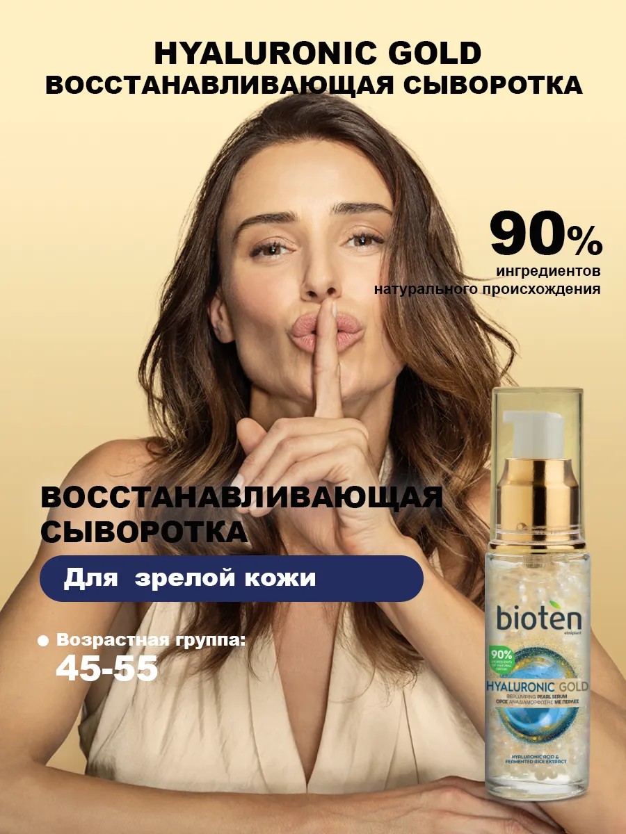 Bioten HYALURONIC GOLD Replumping Serum с технологией Pearl Technology и 90% ингредиентов натурального происхождения предлагает максимальную силу против морщин, чтобы возродить естественную молодость вашей кожи.