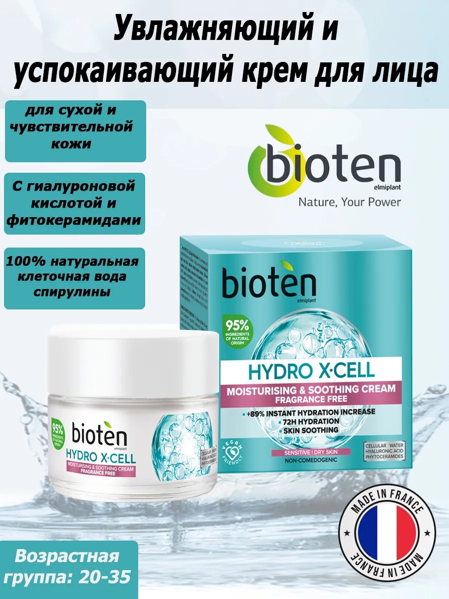 Если вы ищете идеальное средство для ухода за чувствительной и сухой кожей, обратите внимание на увлажняющий и успокаивающий крем для лица от Bioten. Этот крем, произведенный во Франции и созданный на основе греческих традиций, сочетает в себе мощные натуральные ингредиенты, которые обеспечивают вашей коже заботу и защиту.Состав Bioten Hydro X Cell включает 95% компонентов натурального происхождения, что делает его идеальным выбором для тех, кто ценит экологически чистую косметику. Легкая кремовая текстура некомедогенна и не содержит отдушек, что минимизирует риск аллергических реакций. Это особенно важно для женщин в возрасте от 20 до 35 лет, которые стремятся сохранить молодость и здоровье своей кожи.Формула продукта обогащена 5% мультиактивным увлажняющим комплексом. Гиалуроновая кислота активно восстанавливает кожный покров, наполняя его влагой и придавая эластичность. Клеточная вода спирулины, обладающая 100% натуральным происхождением, питает и увлажняет, а фитоцерамиды укрепляют защитный барьер кожи, удерживая влагу внутри. В результате ваш лицевой овал будет выглядеть свежим, а кожа — ухоженной и здоровой.Крем эффективно снимает покраснения, зуд и ощущение стянутости, устраняя сухость и обеспечивая длительное увлажнение до 72 часов. Это делает его идеальным вариантом для ежедневного использования, особенно в условиях переменчивого климата или при недостатке влаги в воздухе.Bioten Hydro X Cell — это не просто увлажняющий крем. Это ваш надежный помощник в борьбе с возрастными изменениями кожи. Благодаря своей уникальной формуле он подходит для антивозрастного ухода, обеспечивая необходимую поддержку и защиту для вашей кожи.Не упустите возможность подарить своей коже качественный уход, который она заслуживает. Попробуйте Биотен Гидро Икс Сэлл и ощутите разницу уже с первого применения. Убедитесь, что ваша кожа получает все необходимое для здоровья и красоты, выбрав продукт, который сочетает в себе эффективность и безопасность. Возрастная группа 20-35 лет.