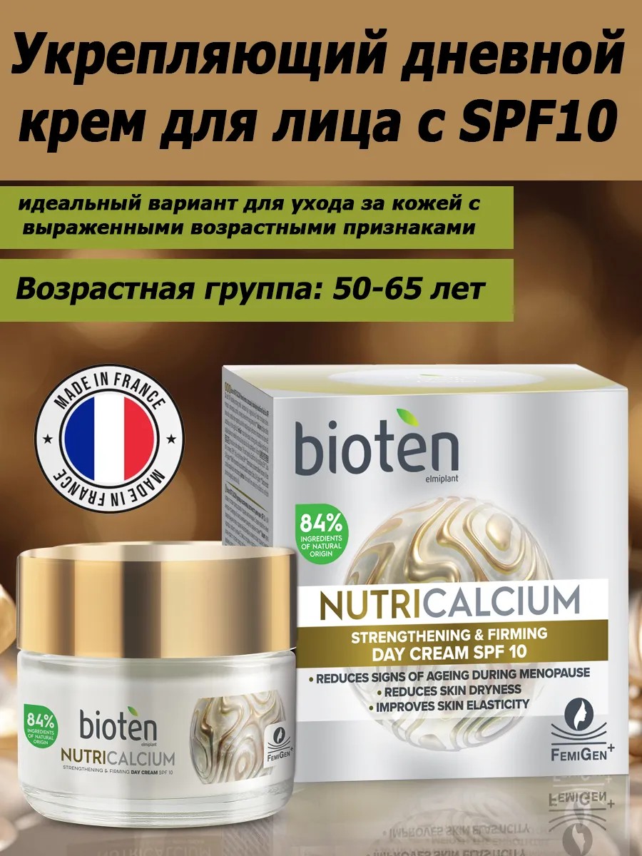 Откройте для себя секрет молодости и красоты с антивозрастным питательным кремом для лица от Bioten NutriCalcium. Этот уникальный продукт, созданный в сердце Франции и вдохновленный природой Греции, идеально подходит для женщин в период менопаузы и постменопаузы, стремящихся вернуть своей коже здоровье и сияние.Биотен Нутрикальциум Aнтивозрастной дневной крем SPF10 содержит 84% ингредиентов природного происхождения, что делает его безопасным и эффективным выбором для ухода за зрелой кожей. Кальций, входящий в состав, способствует улучшению барьерной функции кожи и активирует процессы регенерации, помогая вам выглядеть моложе. В сочетании с мощным экстрактом FemiGen+, этот крем не только разглаживает глубокие морщинки, но и подтягивает контур лица, возвращая ему упругость и эластичность.Особое внимание стоит уделить увлажняющей способности витамина B5, который обеспечивает вашей коже необходимую гидратацию и дарит здоровое сияние. Солнцезащитный фактор SPF 10 защищает от вредного воздействия ультрафиолетовых лучей, что особенно важно для сохранения молодости кожи. Наносите крем на чистую и сухую кожу легкими массирующими движениями, чтобы обеспечить максимальный эффект. Он не только питает и увлажняет, но и оказывает укрепляющее действие, замедляя процесс старения. Выбирая Bioten NutriCalcium, вы получаете не просто уходовую косметику, а настоящую антивозрастную силу, способную преобразить вашу кожу. Французская косметика Bioten — это надежный помощник в борьбе с признаками старения, который подарит вам уверенность и красоту. Не упустите возможность подарить своей коже заботу, которую она заслуживает. Откройте для себя антивозрастной крем, который сделает вашу кожу упругой, молодой и сияющей! Bioten NutriCalcium – это не просто крем, а настоящая находка для кожи от 50 до 65 лет.