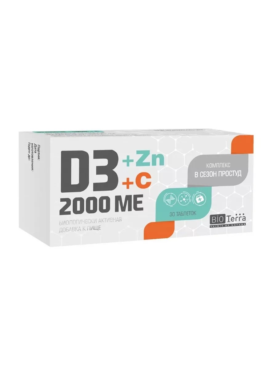 Bioterra Д3 2000МЕ +цинк+С комплекс в сезон простуд - это биологически активная добавка (БАД) к пище. Сочетание активных ингредиентов с выраженными антиоксидантными свойствами способствует укреплению иммунитета, восстановлению защитных сил организма в период сезонных эпидемий гриппа и простуды. Усовершенствованная формула для усиления иммунной поддержки, снижения риска простудных и вирусных заболеваний. В упаковке содержится 30 таблеток массой по 600 мг каждая. Рекомендуется принимать лицам старше 18 лет по 1/4 таблетки в день во время еды. Рекомендуется ежедневный прием в период эпидемий гриппа и простуд. Курс приема 1 месяц. При необходимости курс приема можно повторить. Перед применением рекомендуется проконсультироваться с врачом.