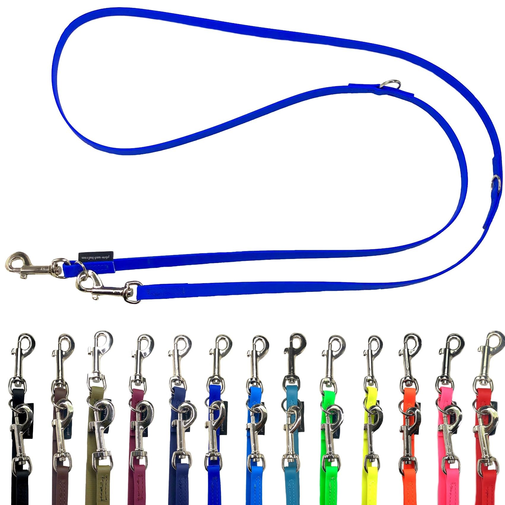 We only use original biothane.Biothane is a US patent.It was developed for equestrian sports.This robust material has similar properties to leather, but is more durable, durable and absolutely waterproof.Simply clean with a moist sponge.Biothane does not cause any scouring points on the dog, even with long hair there is no hair breakage.Biothane is a nylon fabric covered with urethane.It is form -stable, tear -resistant and remains flexible even in the cold.These leash are available in 12 different colors and in 5 different lengths.The lengths of 2.00m and 2.40m are adjustable 3 times, the 2.80m and 3.50m are 4-fold and the 5.00m leash is adjustable 5 times.For small dogs we recommend the 9mm wide leash (up to approx. 12kg), for medium dogs the 13mm wide leash (up to approx. 25kg) and for large dogs the 16mm wide double linen (up to approx. 60kg).This biothane double line is produced in your own production in Germany and thus receives a made in Germany quality!.