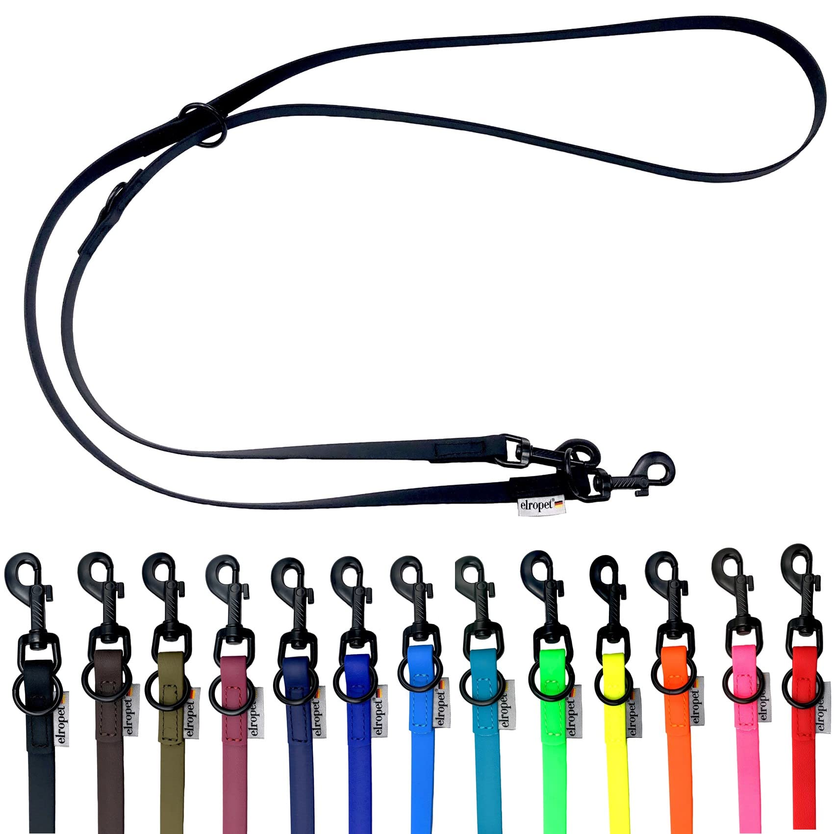 Biothane is a US patent.It was developed for equestrian sports.This robust material has similar properties to leather, but is more durable, durable and absolutely waterproof.Simply clean with a moist sponge.Biothane does not cause any scouring points on the dog, even with long hair there is no hair breakage.Biothane is a nylon fabric covered with urethane.It is form -stable, tear -resistant and remains flexible even in the cold.These leash are available in 12 different colors and in 5 different lengths.The lengths of 2.00m and 2.40m are adjustable 3 times, the 2.80m and 3.50m are 4-fold and the 5.00m leash is adjustable 5 times.For small dogs we recommend the 9mm wide leash (up to approx. 9kg), for medium dogs the 13mm wide leash (up to approx. 20kg) and for large dogs the 16mm wide double linen (up to approx. 60kg).We only use original biothane.This biothane double line is produced in your own production in Germany and thus receives a made in Germany quality!.