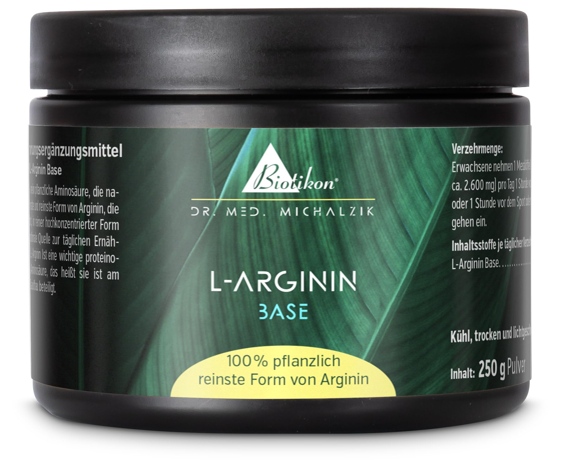 Made in Germany. L-Arginine Basic Powder according to Dr. med. Michalzik. Provides 250 g of high-purity L-arginine obtained from natural sources through fermentation. This semi-essential, basic, and proteinogenic amino acid is available in its pure form and supports a balanced diet. Free from artificial additives, gluten, and GMOs, the powder is ideal for vegans and vegetarians. L-Arginine Basic Powder according to Dr. med. Michalzik is characterized by exceptional purity and quality and offers excellent bioavailability. Thanks to its specific chemical form known as arginine basic, the arginine is present in its most natural form, without additional chemical modifications. This means there is no pH-adjusted acid, as may be the case with other forms of arginine derivatives. This product is designed to support an active and healthy lifestyle by providing an important nutrient in an easily absorbed form. With a recommended daily intake, it offers flexible options for those who wish to supplement their diet naturally. Made in Germany to the highest quality standards and packaged in an aluminum-free seal. Package contents: 250 g of pure L-Arginine base powder according to Dr. Med. Michalzik. One scoop per day provides 2,600 mg of L-arginine. Dosage: Adults take one scoop (approximately 2,600 mg) daily, one hour before a meal or one hour before exercise or bedtime. Ingredients per recommended daily intake (one scoop): L-Arginine Base 2,600 mg Suitable for vegans and vegetarians INGREDIENTS L-Arginine Base SAFETY WARNING Store in a cool, dry place away from light. Important advice: Do not exceed the stated recommended daily dose. Food supplements are not intended to replace a balanced and varied diet and a healthy lifestyle. Use by children, pregnant women, and breastfeeding women only after consulting a doctor. Keep out of reach of children. See moreBIOTIKON Advantages: Free shipping on orders over €70, HACCP food safety certified, original recipe according to Dr. Michalzik, with over 30 years of experience in natural medicine. Manufactured and quality controlled in Germany. We deliver the L-Arginine base powder in a PET box made entirely without plasticizers. ✓ Product Guarantee: Our L-Arginine base powder is manufactured according to the HACCP food safety concept. Gluten-free, lactose-free, gelatin-free, GMO-free, non-irradiated, 100 vegan. Manufactured without chemical additives, such as silicon dioxide or other hidden excipients. The L-Arginine base powder contains 250g of pure, organic L-arginine.Poudre de base L-Arginine selon Dr. med. Michalzik - Sans additifs - de BiotikonDESCRIPTION DU PRODUIT DESCRIPTION DU PRODUIT Fabriquées en Allemagne. Poudre de base L-Arginine selon Dr. med. Michalzik. Fournit 250 g de L-arginine de haute pureté obtenue à partir de sources naturelles par fermentation. Cet acide aminé semi-essentiel, basique et protéinogène est disponible sous sa forme pure et soutient une alimentation équilibrée. Sans additifs artificiels, sans gluten et sans OGM, la poudre est donc idéale pour les végétaliens et les végétariens. La poudre de base de L-Arginine selon le Dr med. Michalzik se caractérise par une pureté et une qualité exceptionnelles et offre une excellente biodisponibilité. Grâce à sa forme chimique spécifique connue sous le nom de base d'arginine, l'arginine est présente sous sa forme la plus naturelle, sans modifications chimiques supplémentaires. Cela signifie qu'il n'y a pas d'acide adapté au pH comme cela pourrait être le cas avec d'autres formes de dérivés d'arginine. Ce produit a été conçu pour soutenir un mode de vie actif et sain en fournissant un nutriment important sous une forme facilement absorbée. Avec un apport journalier recommandé, il offre des possibilités d'utilisation flexibles pour les personnes qui souhaitent compléter leur alimentation de manière naturelle. Fabriqué en Allemagne selon les normes de qualité les plus élevées et emballé dans un joint sans aluminium. Contenu de l'emballage : 250 g de poudre pure de base de L-Arginine selon le Dr. Med. Michalzik, 1 cuillère doseuse par jour correspond à 2 600 mg de L-arginine. Quantité : les adultes prennent 1 cuillère doseuse (correspond à environ 2 600 mg) par jour 1 heure avant le repas ou 1 heure avant le sport ou le coucher. Ingrédients par recommandation journalière 1 cuillère doseuse : L-Arginine Base 2 600 mg. Convient aux végétaliens et végétariens INGRÉDIENTS Base L-Arginine AVERTISSEMENT DE SÉCURITÉ Conserver dans un endroit frais, sec et à l'abri de la lumière. Conseils importants : ne pas dépasser la dose journalière recommandée indiquée. Les compléments alimentaires ne sont pas destinés à remplacer une alimentation équilibrée et variée et un mode de vie sain. À utiliser chez les enfants, les femmes enceintes et les allaitantes uniquement après consultation d'un médecin. Tenir hors de portée des enfants. Voir plusAvantages BIOTIKON : à partir de 70 € de livraison gratuite, HACCP sécurité alimentaire, recette originale selon le Dr med. Michalzik, plus de 30 ans d'expérience en médecine naturelle. Fabrication et contrôle qualité en Allemagne. Nous livrons la poudre de base de L-Arginine dans une boîte en PET entièrement fabriquée sans plastifiants. ✓ Garantie du produit : notre poudre de base L-Arginine est fabriquée selon le concept HACCP de sécurité alimentaire. Sans gluten, sans lactose, sans gélatine, sans OGM, non irradié, 100 végétalien. Fabrication sans additifs chimiques, tels que le dioxyde de silicium ou d'autres excipients cachés. La poudre de base de L-Arginine contient 250 g de L-arginine pure sous forme biologique.