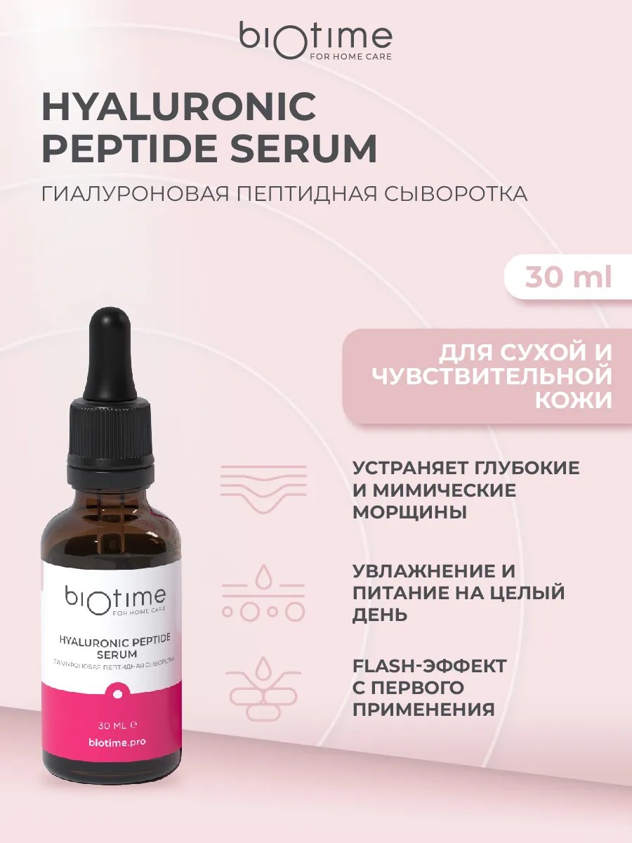 Meet the new line of home care cosmetics from Biotime For Home Care! Hyaluronic Peptide Serum, a multi-peptide serum for the face and eye area with a high concentration of peptides and hyaluronic acid, delivers a pronounced anti-aging and lifting effect. It restores skin's firmness, elasticity, and tone, leaving it hydrated and radiant from within. This serum contains a uniquely high 3.3% concentration of hyaluronic acid, which offers various types and effects. 3% low-molecular hyaluronic acid penetrates deep into the epidermis, intensely hydrating, retaining moisture, and helping the skin recover from aggressive skincare treatments. And 0.3% high-molecular hyaluronic acid provides a lifting effect noticeable immediately after application. This wrinkle-correcting serum also contains an innovative flash-effect ingredient—Novhyal (Novhyal Biotech G), which is a source of building blocks for the skin, stimulates cell regeneration, strengthens the dermal-epidermal junction, and increases internal hyaluronic acid synthesis by 282% in just 48 hours of use! A powerful peptide complex enhances the rejuvenating effect and eliminates wrinkles: Matrixyl replenishes hyaluronic acid, improves skin elasticity and firmness, combats wrinkles, and stimulates collagen and elastin production; Eyeseryl (tetrapeptide-5) improves skin smoothness, reduces puffiness and dark circles under the eyes; Acetyl tetrapeptide-2—an active ingredient that eliminates sagging and sagging; and Diffuporin moisturizes and improves the dermal barrier function, restoring cells after dehydration. After applying the rejuvenating serum, the skin should be sealed with a cream to prevent moisture loss. Biotime skincare products are manufactured using only proven, modern raw materials and equipment, and practicing physicians and cosmetologists participate in their development. Our products are internationally GMP and ISO certified. Biotime—take a step toward perfect skin!