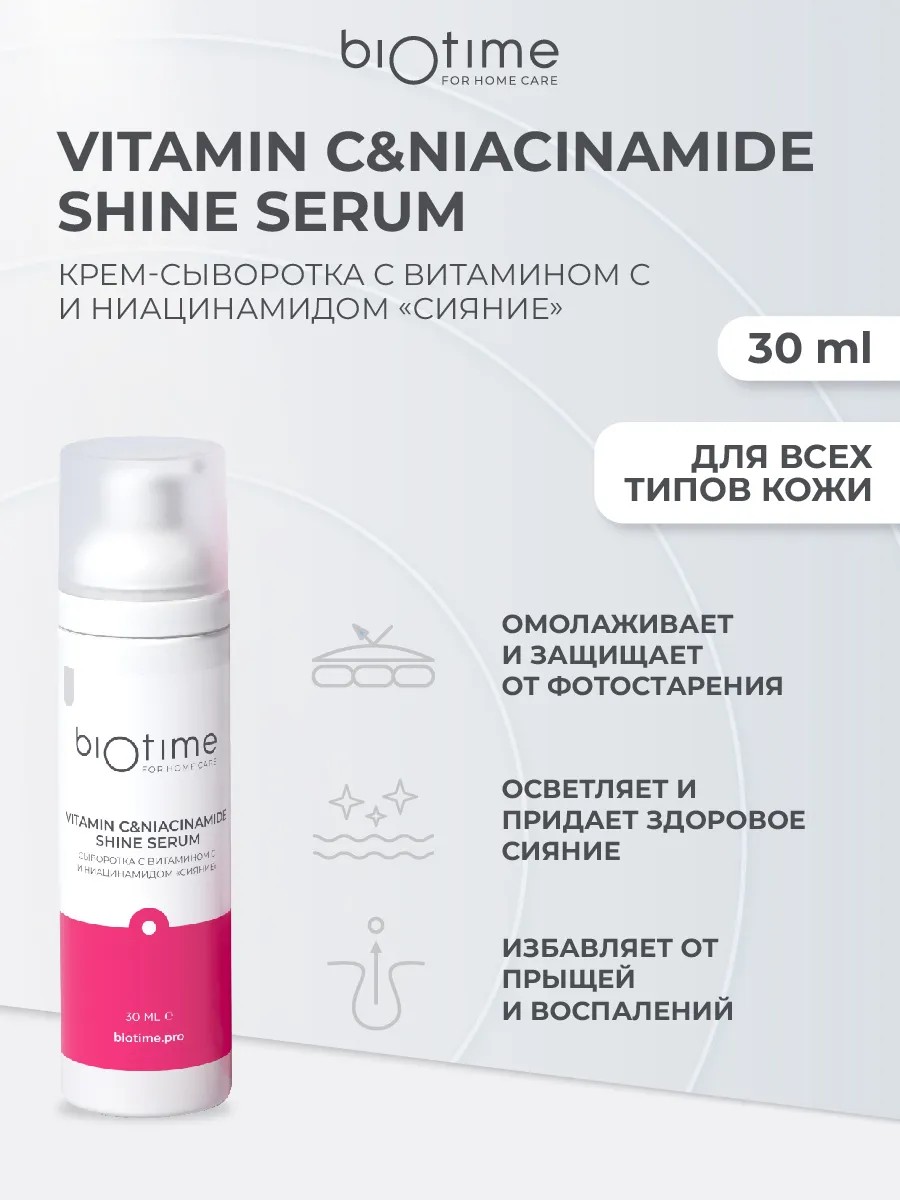 Meet the new line of home care products from Biotime For Home Care! Vitamin C & Niacinamide Shine Serum rejuvenates, eliminates excessive pigmentation, evens out skin tone, and imparts a natural glow. This effect is achieved through an effective combination of vitamin B and vitamin C in its latest stable 3-O form, which prevents oxidation upon entering the dermis. Vitamin C is an effective anti-ageing agent; it whitens and brightens skin, leaving it radiant and fresh, stimulates collagen production, and reduces puffiness. Niacinamide (vitamin B) acts as an enhancer, allowing vitamin C to penetrate deep into the epidermis, thereby enhancing its effects. It also effectively clears pimples, acne, and post-acne marks from the skin, provides a disinfectant and anti-inflammatory effect, tightens pores, and mattifies the skin. Vitamin E complements the vitamin complex: with its powerful antioxidant properties, it protects the skin from external factors that cause premature aging. Copper tripeptide in the rejuvenating serum stimulates collagen and elastin production, making the skin smoother and more elastic, and also has an anti-inflammatory effect. Squalane and macadamia oil nourish the skin and help retain moisture. The anti-aging serum has an emulsion texture and creates a soft protective film that helps the active ingredients work on the skin's surface, not just in the deeper layers of the epidermis, making it suitable for use as a cream. The balanced composition of the cream-serum makes it suitable for all skin types: dry, problematic, oily, combination, and non-irritating, even for the most sensitive skin. Biotime skincare products are manufactured using only proven, modern raw materials and equipment, and developed with the help of practicing physicians and cosmetologists. Our products are internationally GMP and ISO certified. Biotime—take a step toward perfect skin!